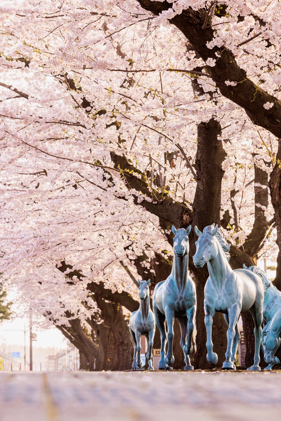 「日本の道・100選」に選ばれた十和田市官庁街通り。長さ1.1kmの道にて、155本の桜が160本の松と4列の並木を作り、春には、一面がピンク色に染まる美しい景色を生み出します。歩道両側に配置されている現代アートの作品や馬にまつわるオブジェが桜を際立たせて、とっても魅力的です。