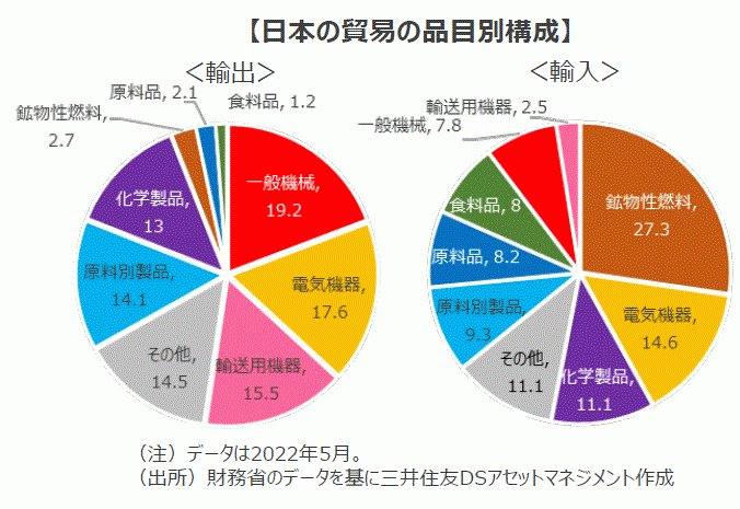 ■一方輸入額では、原油、石油製品、液化天然ガスなどの鉱物性燃料が27.3%となっています。ウクライナ情勢によって、原油価格が大幅に上昇するなど、鉱物性燃料は価格が上昇しています。ウクライナ情勢が長期化しつつある中、欧州を中心にロシアからのエネルギー輸入を減らす取り組みが続く見込みです。その不足分を他で補う必要があるため、世界的に需給がひっ迫し、エネルギー価格は高止まりすると見られます。このため、今後も『貿易赤字』の大きな要因となりそうです。