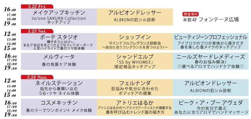 参加ショップ:シャンドエルブ、メルヴィータ、メイクアップキッチン、アルビオンドレッサー、フェルナンダ、ショップイン、ニールズヤードレメディーズ、ボーテスタジオ、アトリエはるか、ビューティジーンプロフェッショナル、ネイルステーション、コスメキッチン