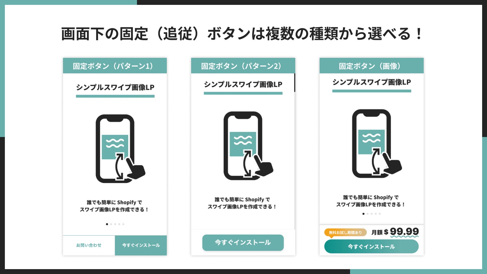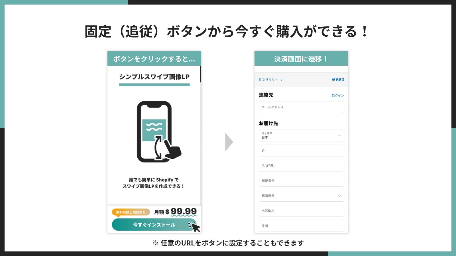 スワイプ中でも画面下部に常に表示される固定ボタンを設置し、「今すぐ購入」や「お問い合わせ」といったアクションをユーザーの目に留まる位置にキープ。どのスライドを見ていてもボタンが追従するため、購買アクションへの導線を逃さず、コンバージョン率の向上に貢献します。