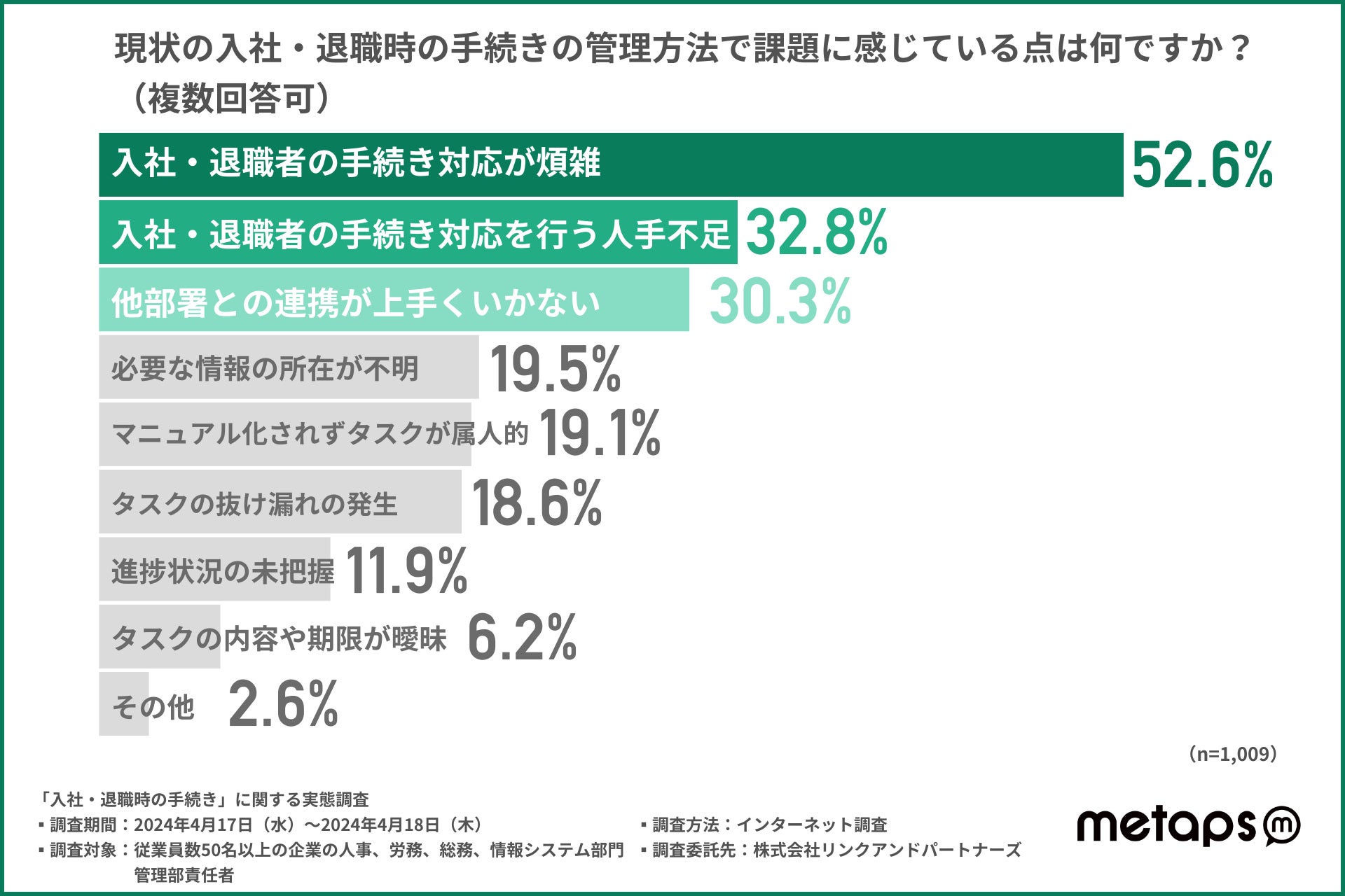「現状の入社・退職時の手続きの管理方法で課題に感じている点は何ですか?(複数回答可)」(n=1,009)と質問したところ、「入社・退職者の手続き対応が煩雑」が52.6%、「入社・退職者の手続き対応を行う人手が足りない」が32.8%、「他部署との連携(コミュニケーション)が上手くいかない」が30.3%、という回答となりました。