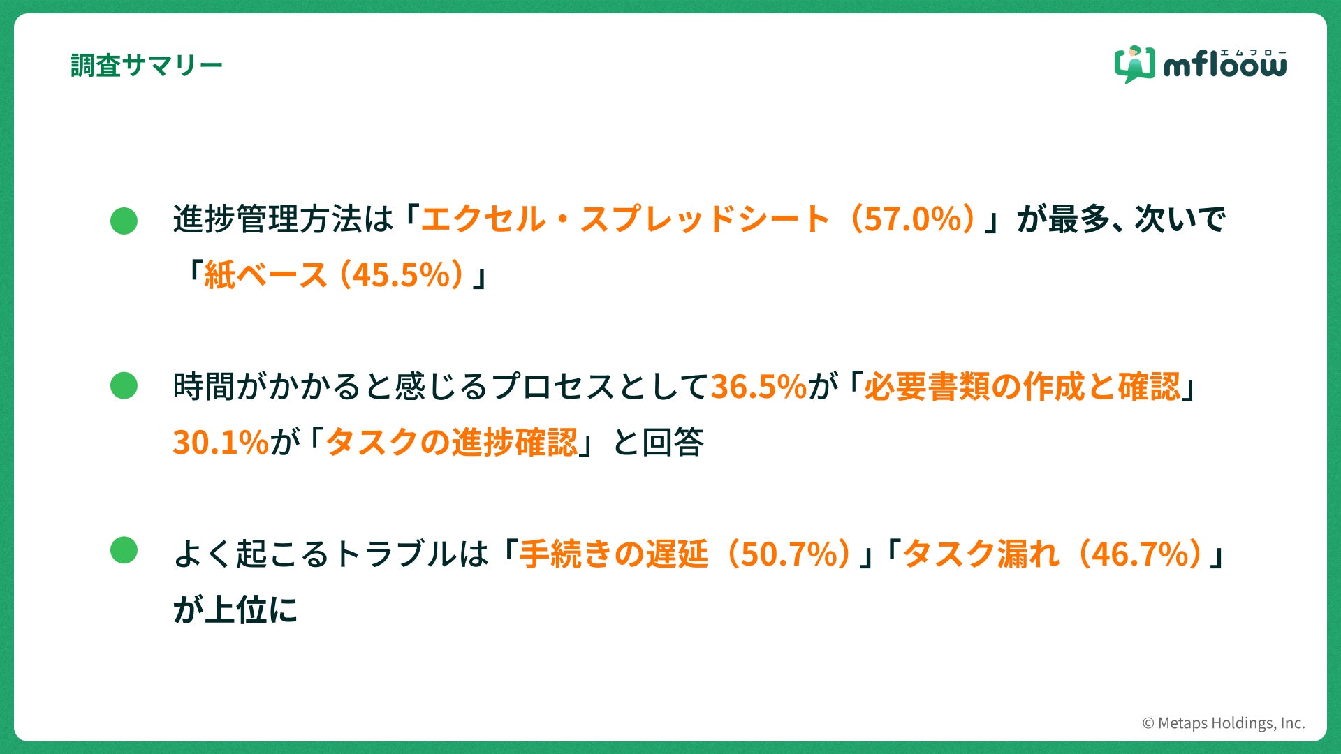 従業員ライフサイクル一元管理ツール『mfloow(エムフロー)』を提供する株式会社メタップスホールディングス(渋谷区、代表取締役社長 山﨑 祐一郎)は、社員の入社・退職手続きを行う人事や総務の担当者1,009名に対し、「入社・退職時の手続き」に関する実態調査を実施しました。その結果、進捗管理は主にエクセル・スプレッドシートと紙ベースで行われていることがわかりました。また、よく起こるトラブルとして手続きの遅延やタスク漏れが上位に挙がりました。
