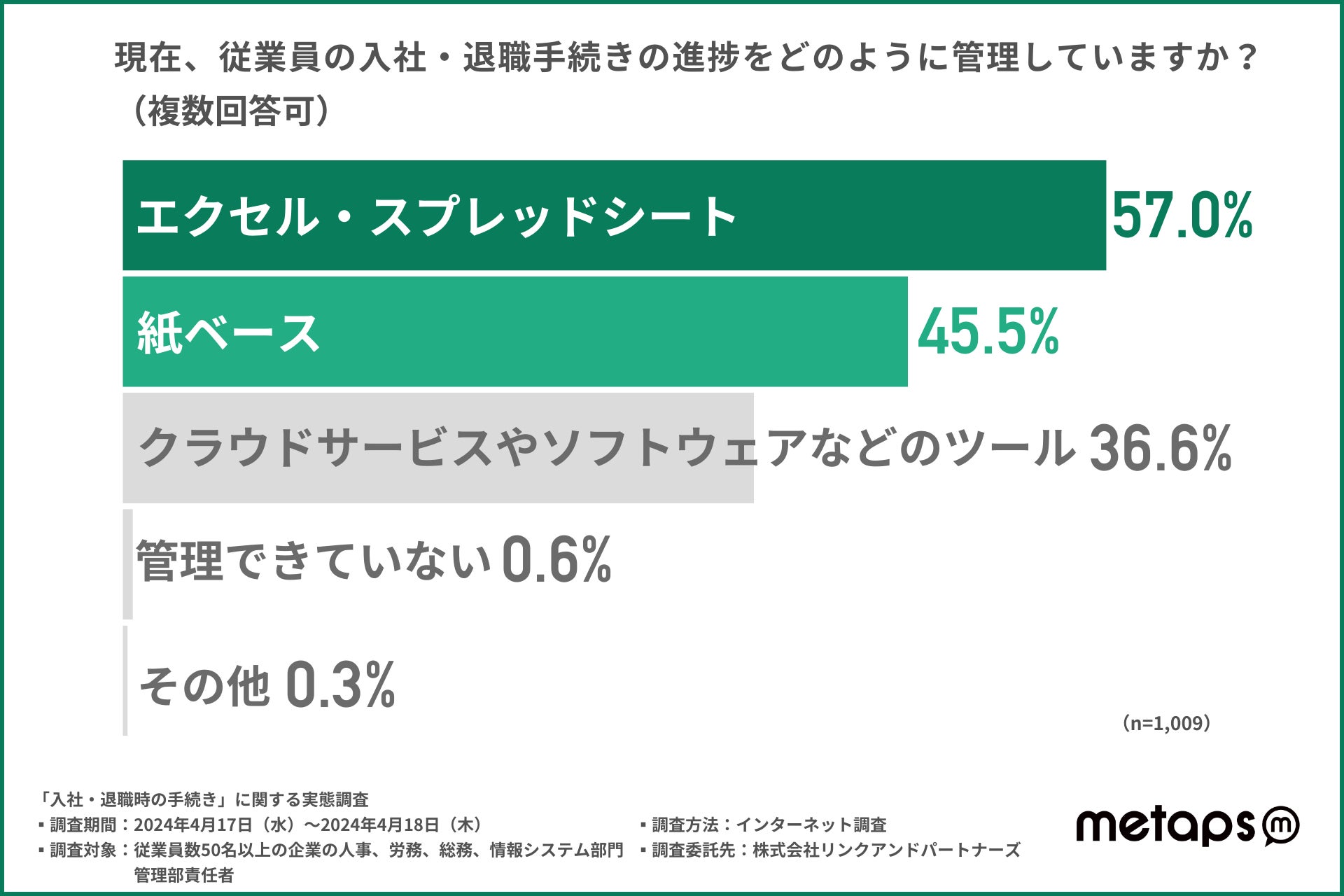 「現在、従業員の入社・退職手続きの進捗をどのように管理していますか?(複数回答可)」(n=1,009)と質問したところ、「エクセル・スプレッドシート」が57.0%、「紙ベース」が45.5%、「クラウドサービスやソフトウェアなどのツール」が36.6%という回答となりました。