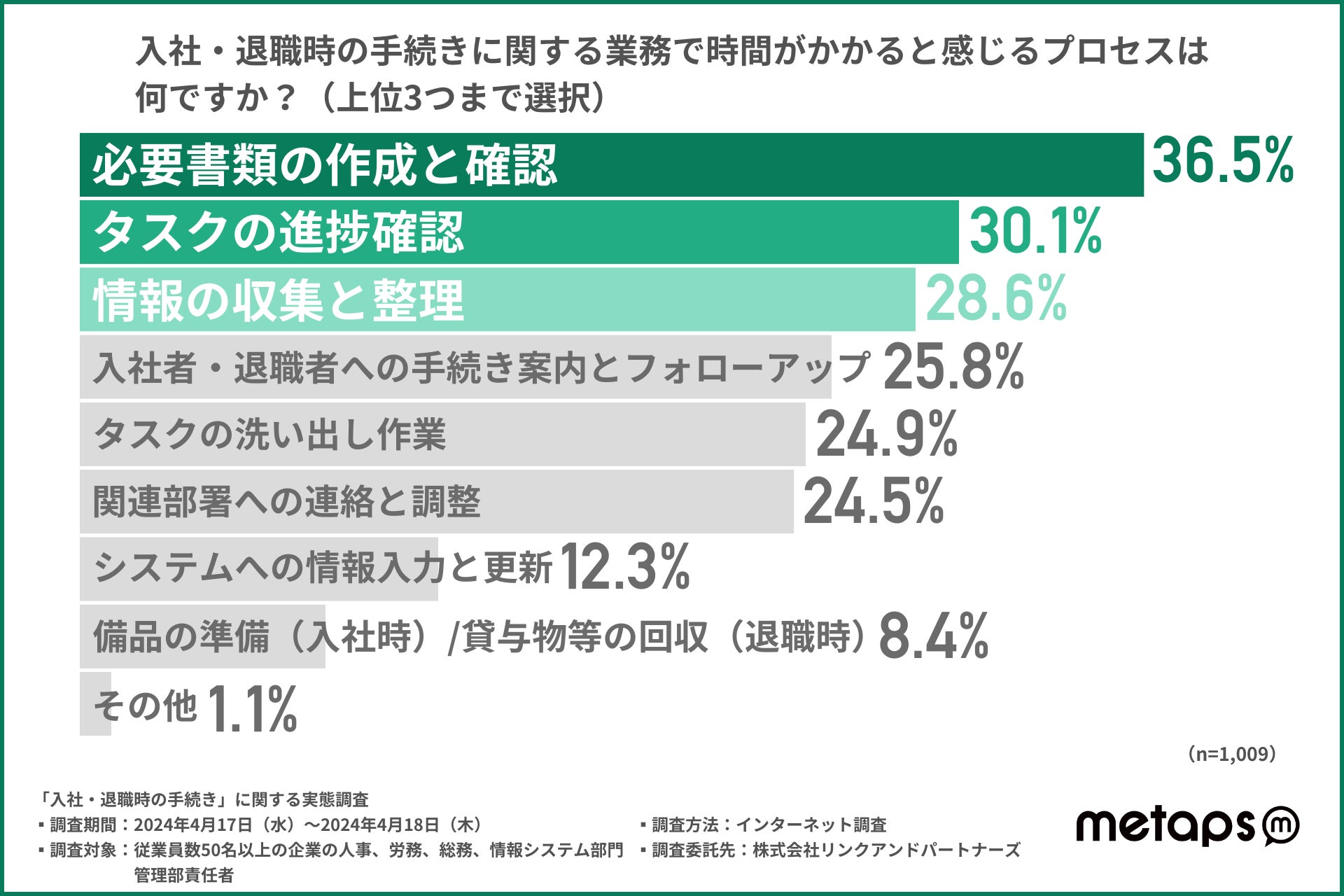 「入社・退職時の手続きに関する業務で時間がかかると感じるプロセスは何ですか?(上位3つまで選択)」(n=1,009)と質問したところ、「必要書類の作成と確認」が36.5%、「タスクの進捗確認」が30.1%、「情報の収集と整理」が28.6%、という回答となりました。