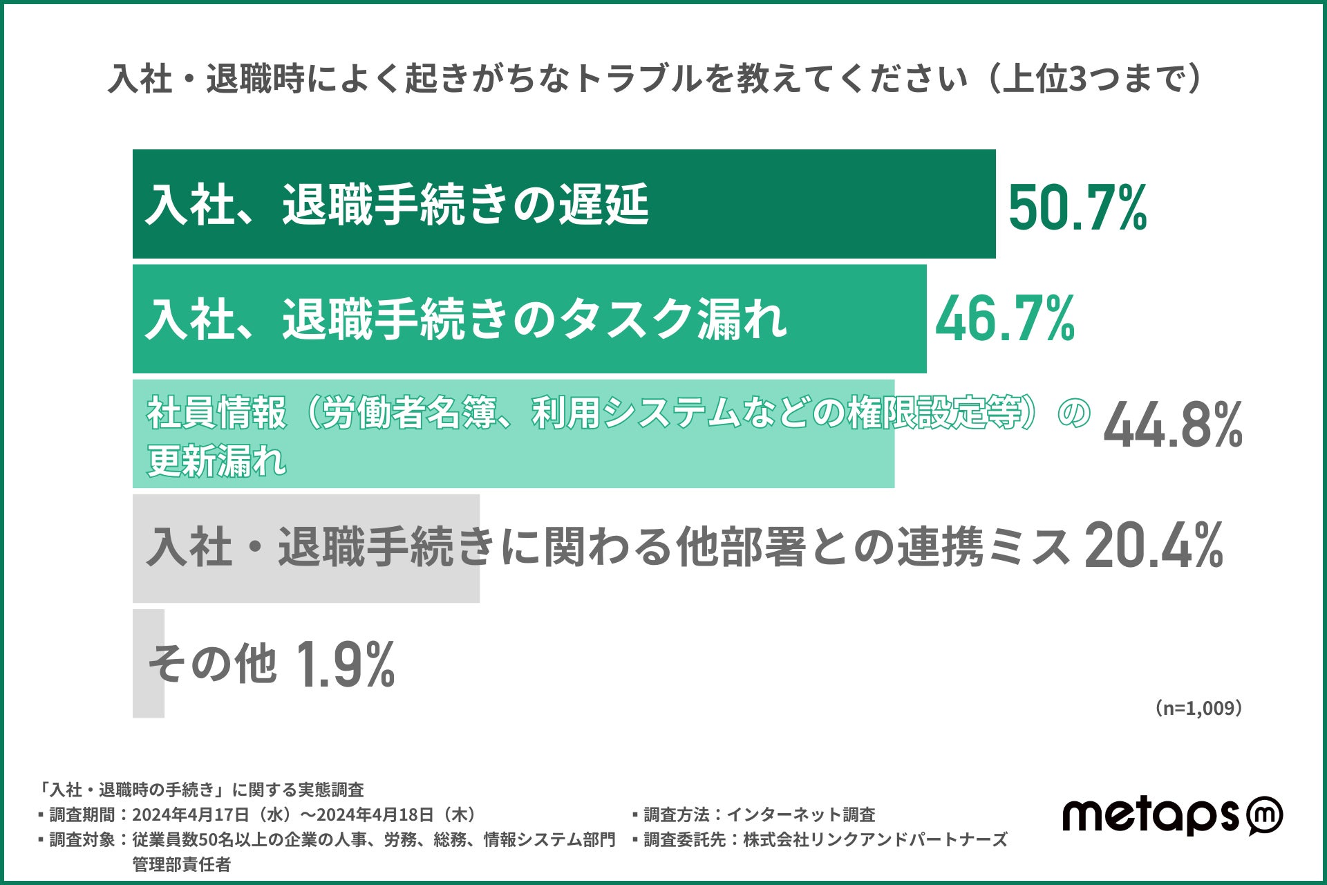 「入社・退職時の手続きでによく起きがちなトラブルを教えてください(上位3つまで)」(n=1,009)と質問したところ、「入社・退職手続きの遅延」が50.7%、「入社・退職手続きのタスク漏れ」が46.7%、「社員情報の更新漏れ」が44.8%という回答となりました。