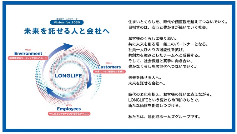 旭化成ホームズグループが2030年に目指す姿として策定した「Vision for 2030」の概要と当社グループのマテリアリティ「With Customers」「With Environment」「With Employees」「Our Integrity」という4つのテーマに関する取り組みをそれぞれ紹介しています。