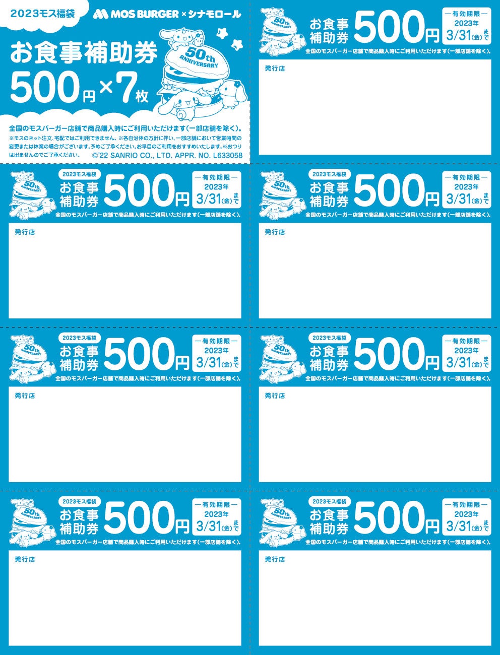 モスバーガーを展開する株式会社モスフードサービス(代表取締役社長:中村 栄輔、本社:東京都品川区)は、2022年12月30日(金)から全国のモスバーガー店舗(一部店舗除く)にて、株式会社サンリオの人気キャラクター『シナモロール』とコラボレーションしたグッズと、福袋の販売額相当の“お食事補助券”が入った「2023モス福袋」(3,500円)を数量限定で販売します。また、2022年12月1日(木)~12月26日(月)の間、ネットでの事前予約を受け付けます。https://www.mos.jp/cp/fukubukuro/