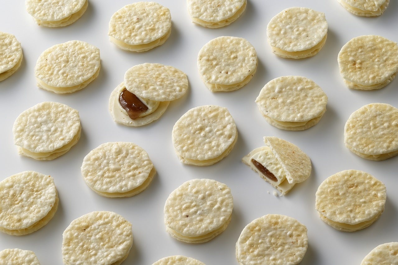 あんこの水分がせんべいに移らないように試行錯誤を繰り返し最終的に自社オリジナルのホワイトチョコを利用した革新技法で、繊細にコーティングしました。水分の移行を防ぎながら、しろえび×あんこ×チョコレートコーチングの味のバランスの黄金比の組み合わせにたどり着きました。