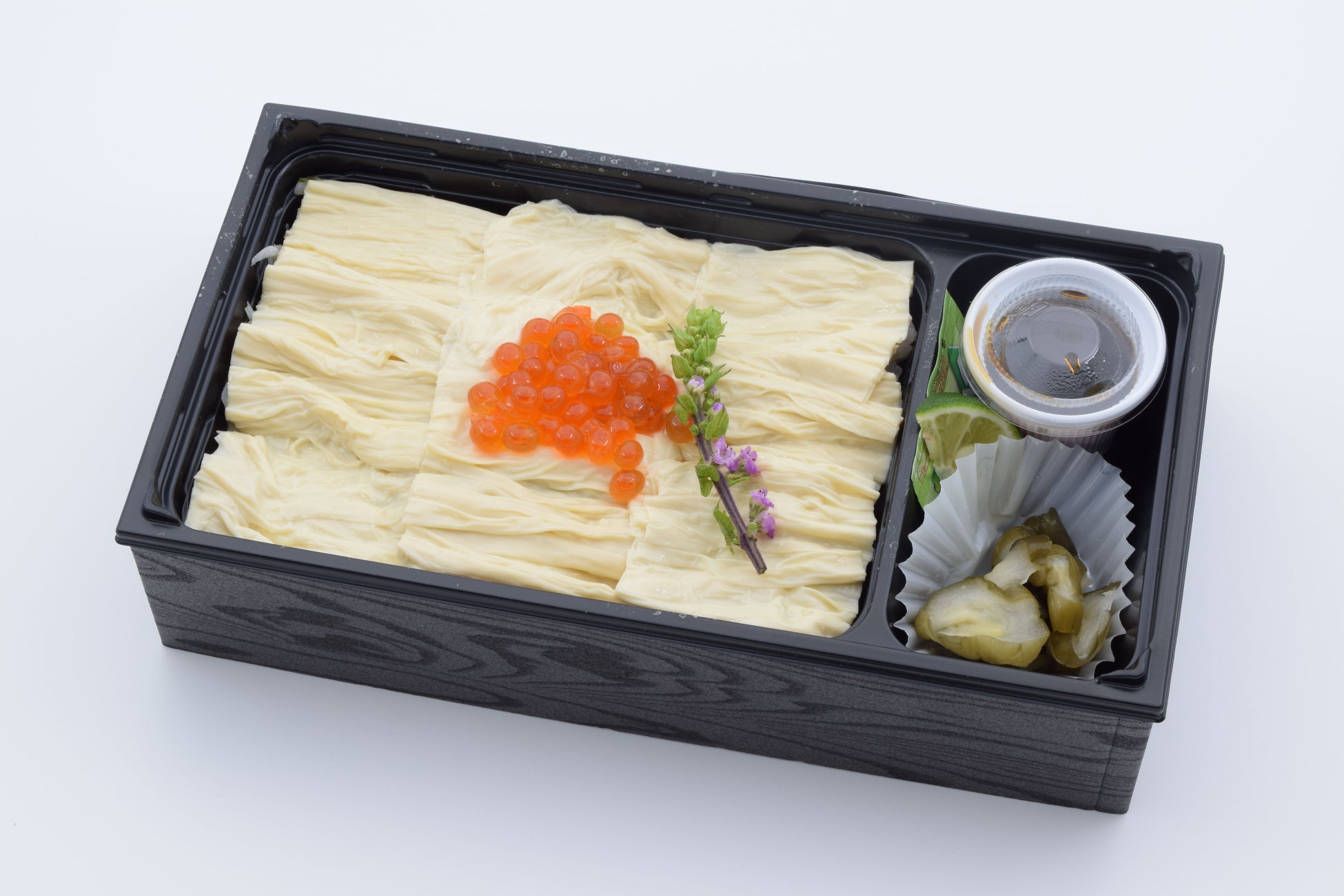 たぐり湯葉を一面に使用し、釜揚げしらすと大葉を混ぜ込んだご飯。