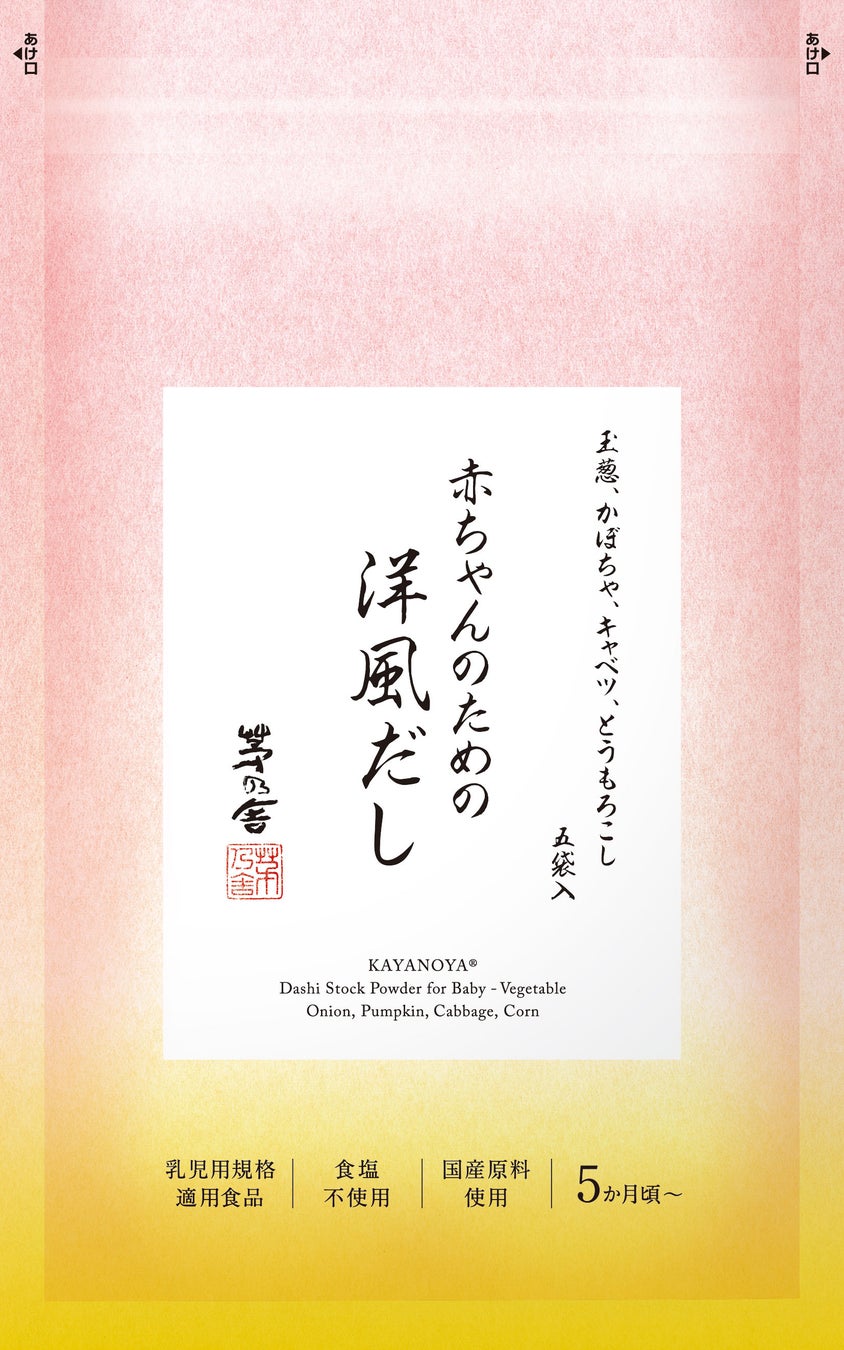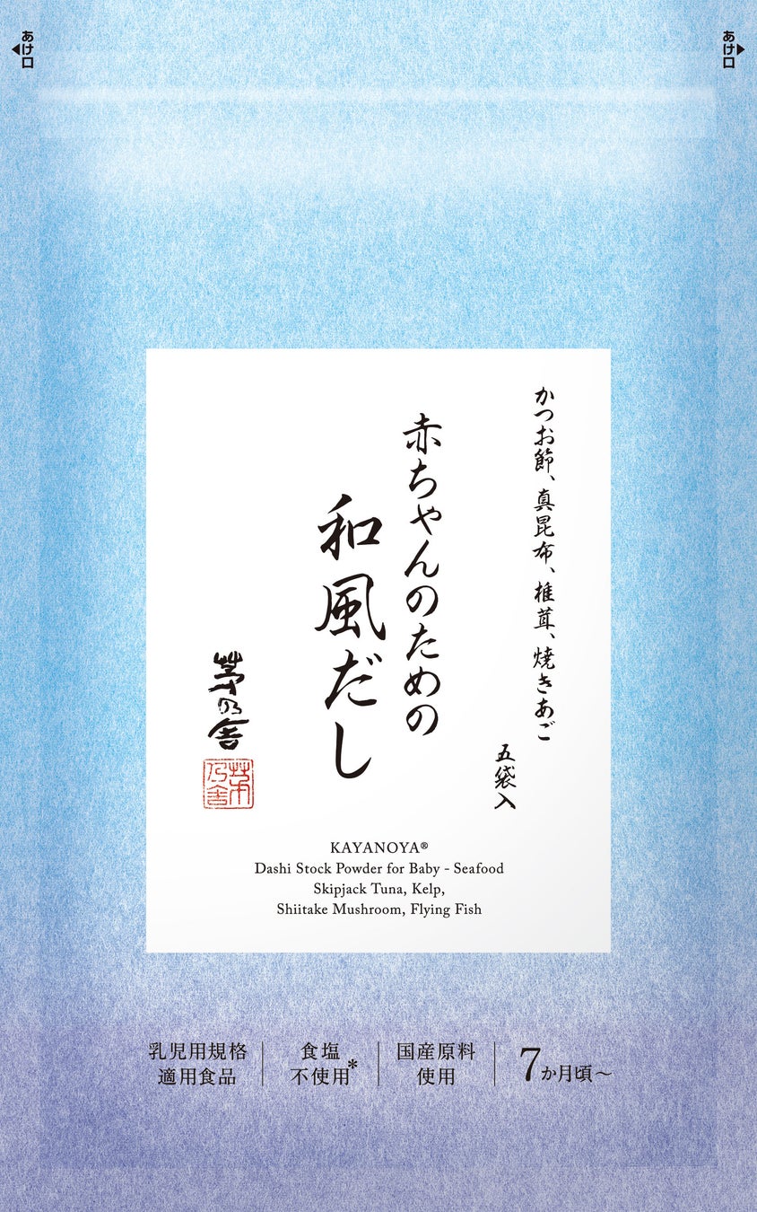 赤ちゃんのはじめての食事は、ご家族にとってもはじめて尽くし。茅乃舎は、ご家族が安心して食べさせてあげられることが大切だと考え、厳選した国産の素材を使用しています。食塩も調味料も一切使っていない、煮出すだけで簡単に本格的なだしがとれる「だしパック」です。【かつお節・真昆布・椎茸・焼きあご】の4種のまろやかな“うまみ”を掛け合わせた「和風だし」と【玉葱・かぼちゃ・キャベツ・とうもろこし】の野菜のやさしい“甘み”を引き出した「洋風だし」の2種類をご用意いたしました。