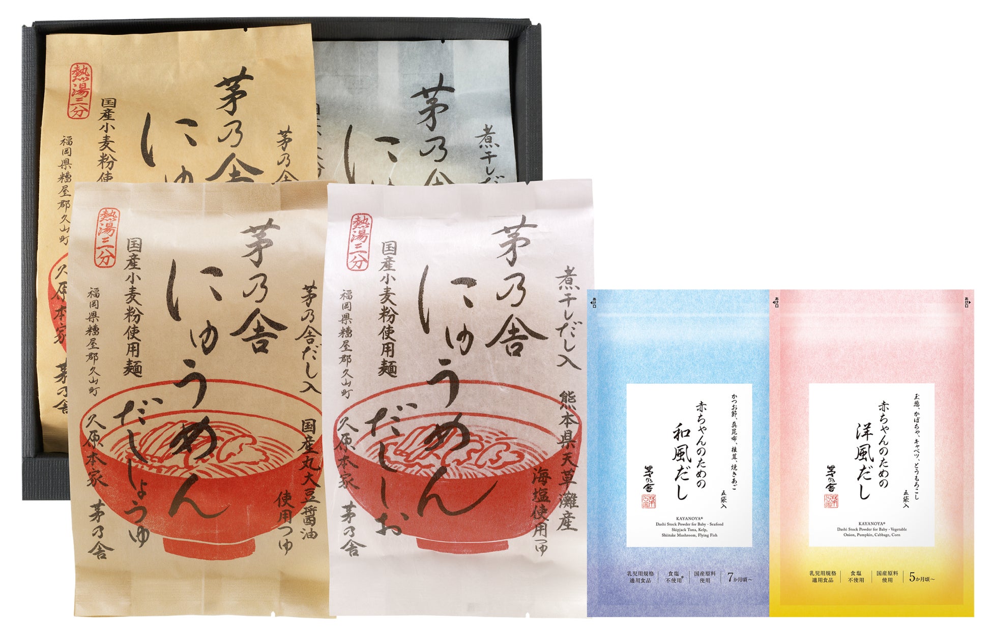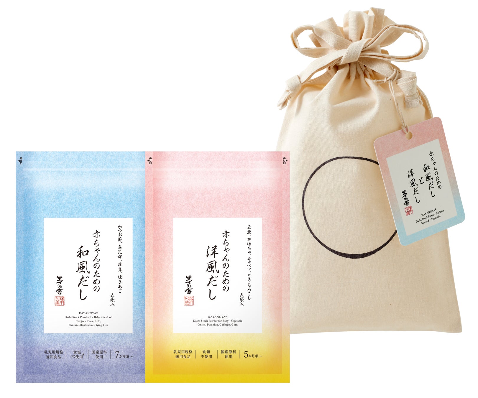 離乳食に手間ひまをかけたいけれど、日々の暮らしに追われてなかなか手を掛けられない、忙しいお母さん、お父さんに寄り添う、赤ちゃんのためのだしはギフトにもおすすめです。「赤ちゃんのための和風だし・洋風だし」が巾着に入ってセットになった「赤ちゃんのためのだし きんちゃくセット」や、お湯を注ぐだけで簡単にお召し上がりいただける「茅乃舎にゅうめん」を組み合わせた「ご家族いたわりギフト」など、もらってうれしいセット商品も取り揃えております。