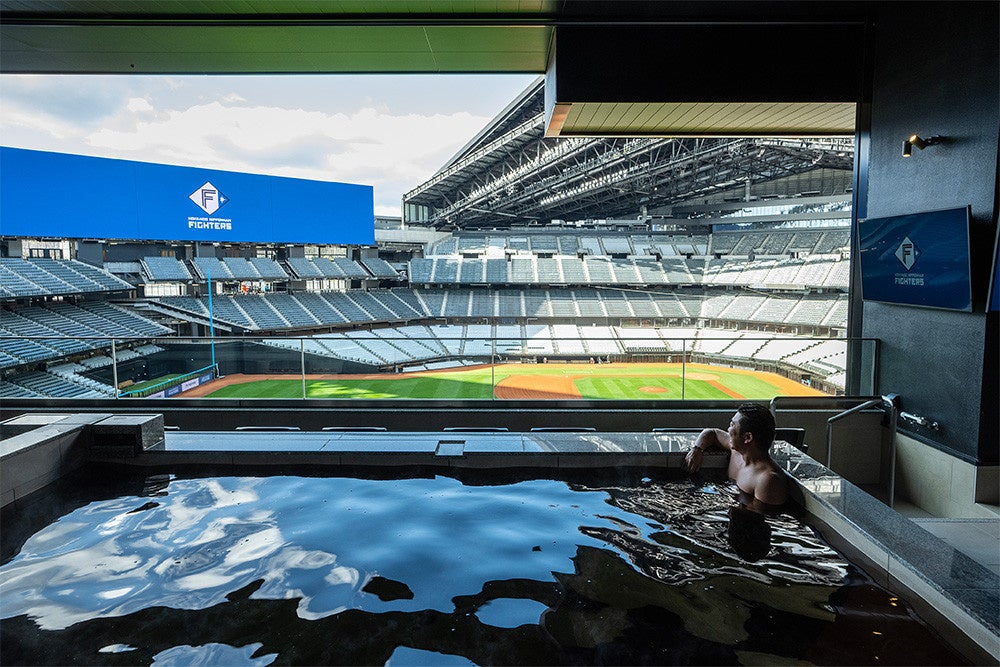 水風呂の代わりに、北海道ならではのパウダースノーにダイブ!北海道の雄大な自然とスタジアムのフィールドビューの両方を満喫できる「ととのい」は唯一無二の体験です。サウナのあとは天然温泉に入りながら、ゆったり過ごすことができます。ここでしかできない特別な体験をお楽しみください。