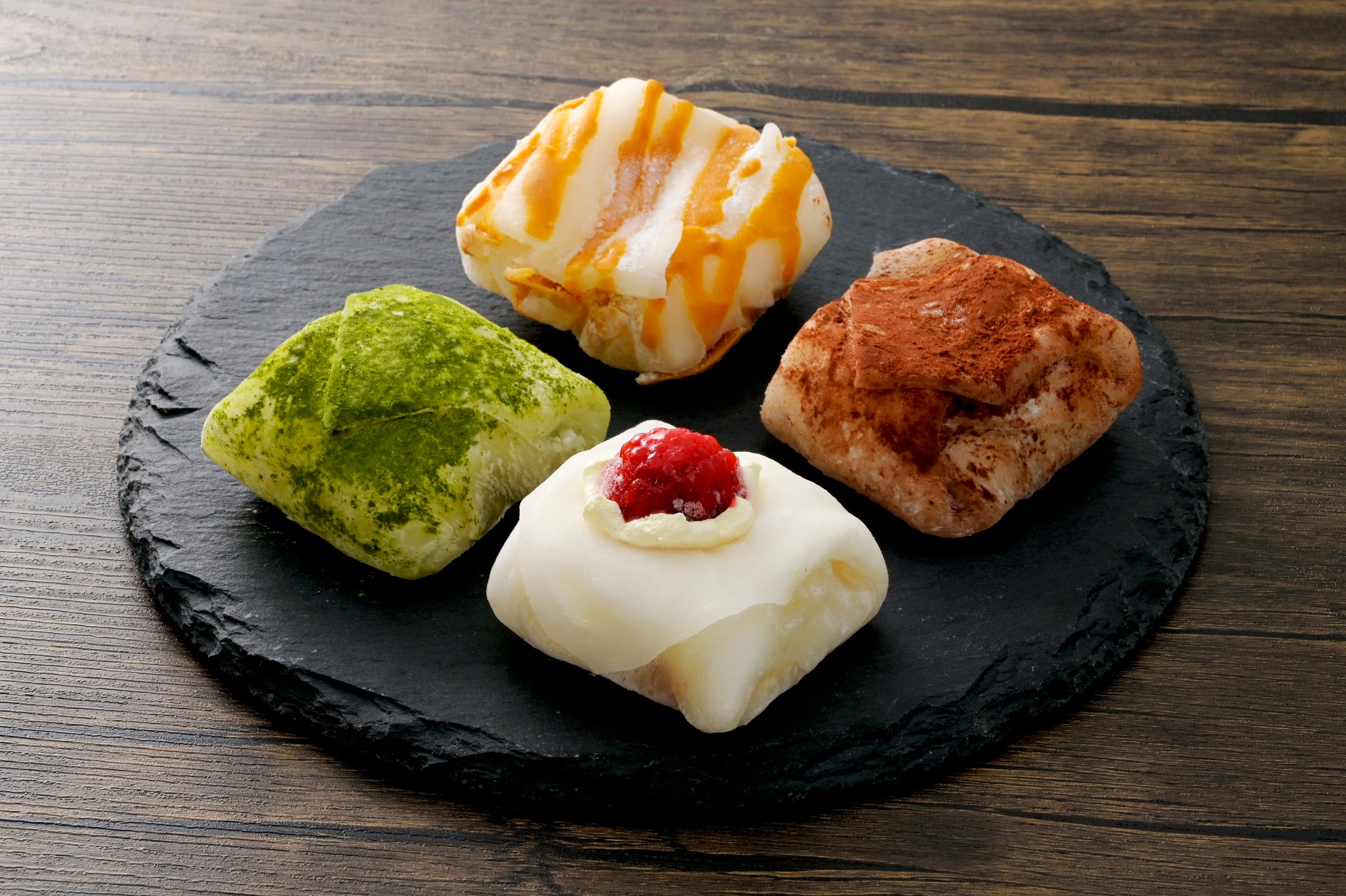 抹茶ティラミス、イチゴティラミス、チョコティラミス、そしてカスタードティラミス、4種類のフレーバーがそろってます!それぞれがふんわりとした求肥に包まれた絶品の味わい。