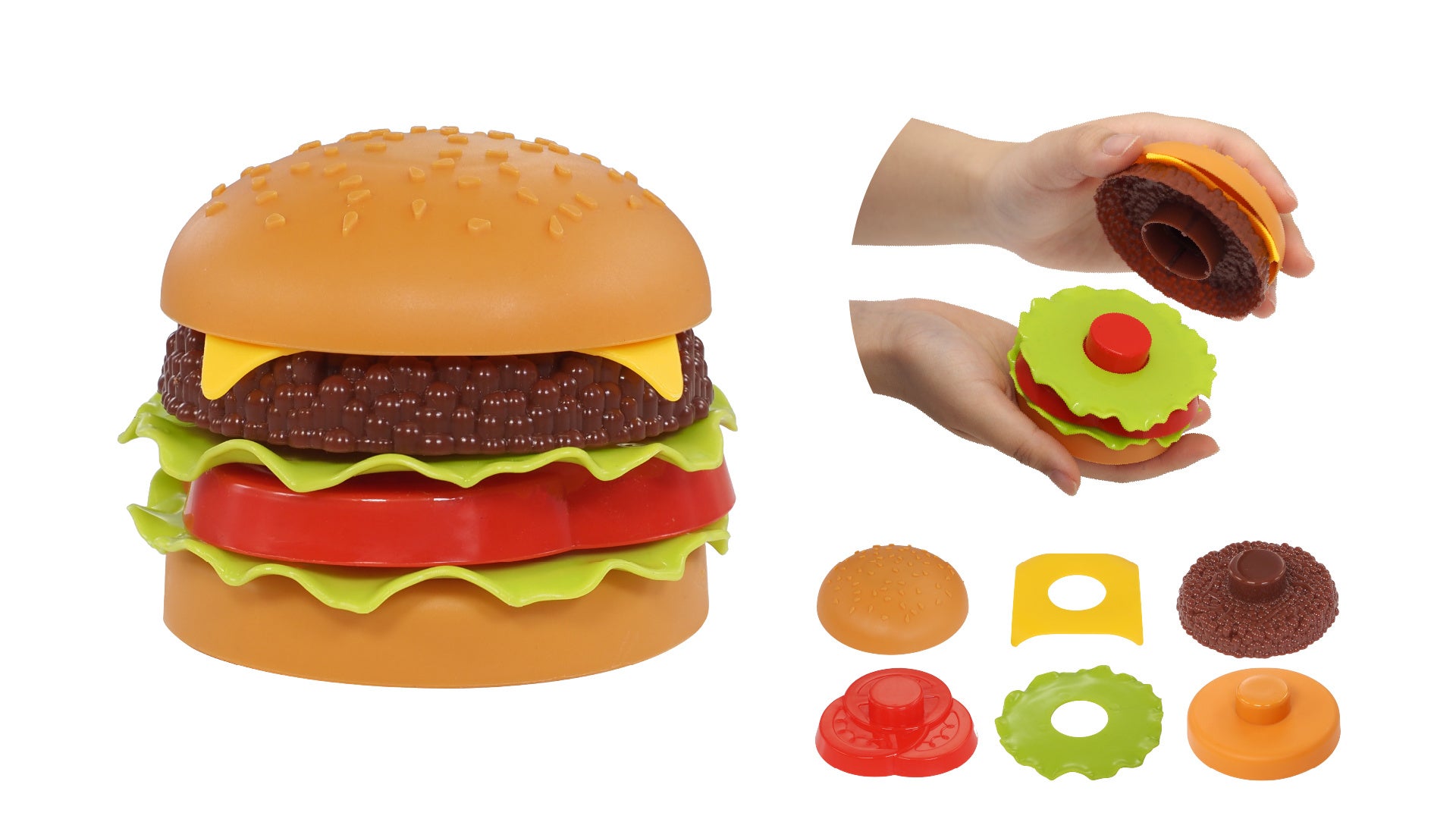 特徴:思わず食べちゃいそうな、ハンバーガーが登場!トッピングを全のせして、”チーズレタストマトバーガー”にするもよし、トマトを抜いたり、チーズを抜いたり…オリジナルバーガーを作るもよし!美味しそうなハンバーガーを作ってね!お家で憧れのハンバーガー屋さんごっこを楽しもう。