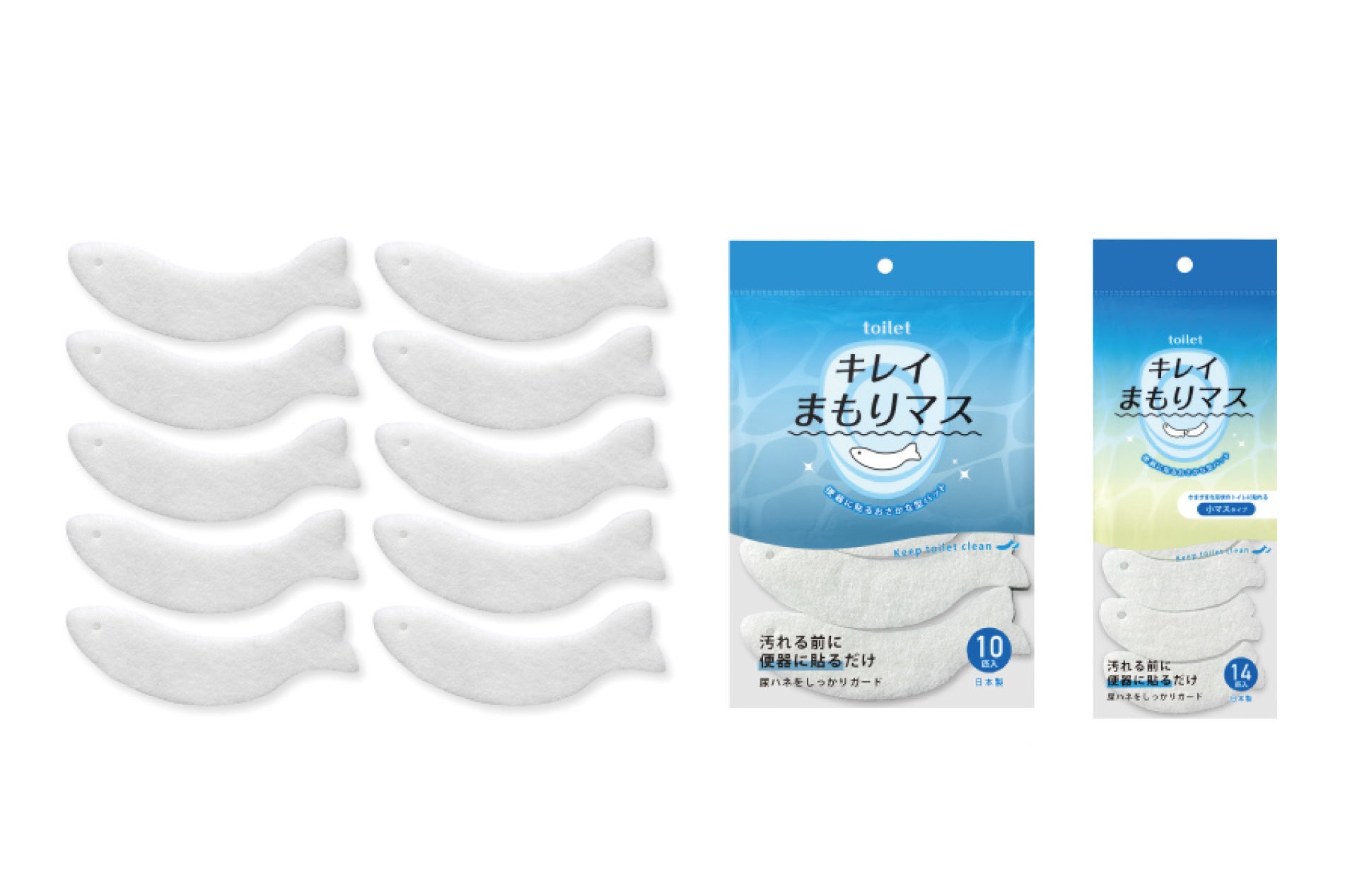 最近は子育て世代の方が、おしっこ吸う〜パットを使用されていることが多くなり、この度「親子で一緒にパットを貼って楽しんでほしい」という想いでお魚型のパットを開発しました。フチに沿う形を試行錯誤し、まるで便器のフチを泳いでいるようなお魚型を作りました。小さなサイズのパットでないと貼ることができない便座もあり、今回親子のマスを作りました。可愛いお魚で飛び散り汚れを防ぎ、毎日の暮らしに少しのゆとりを作っていただきたいと思います。