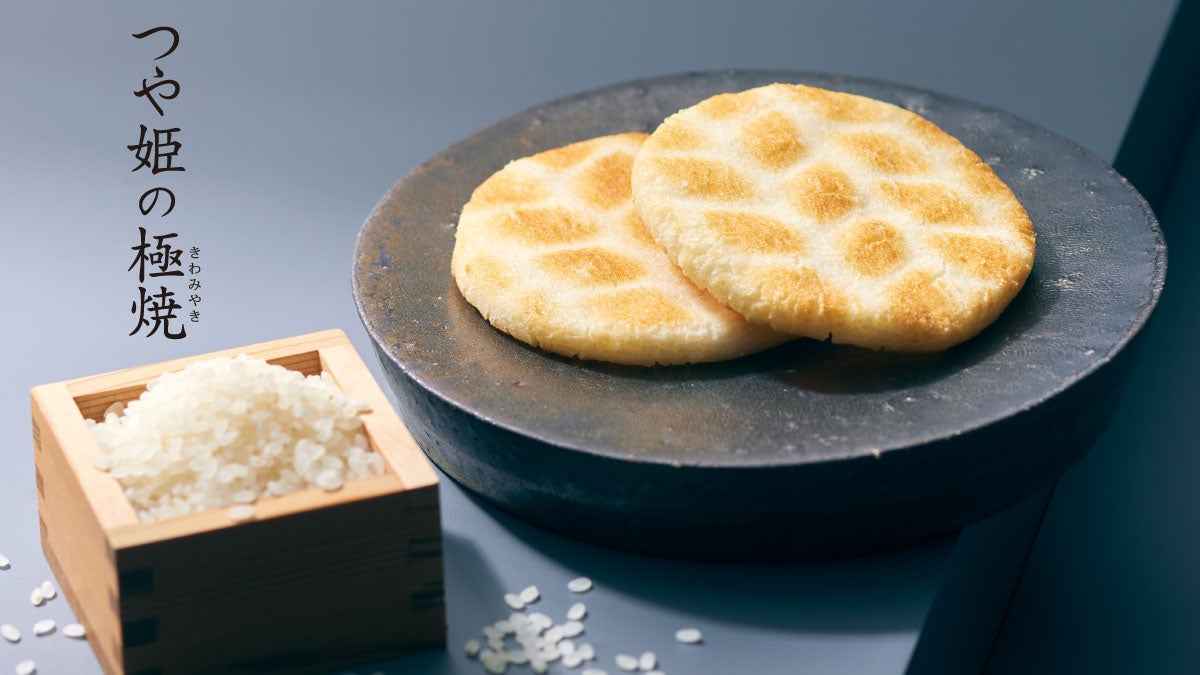 米どころ山形県の代表的高級ブランド米「つや姫」を贅沢に使用したおせんべい「つや姫の極焼(きわみやき)」、