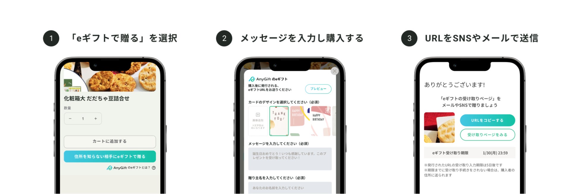 AnyGiftは、相手の住所を知らなくてもLINEやメールで贈ることができる「eギフト機能」を、ECサイトに組み込むことができるサービスです。