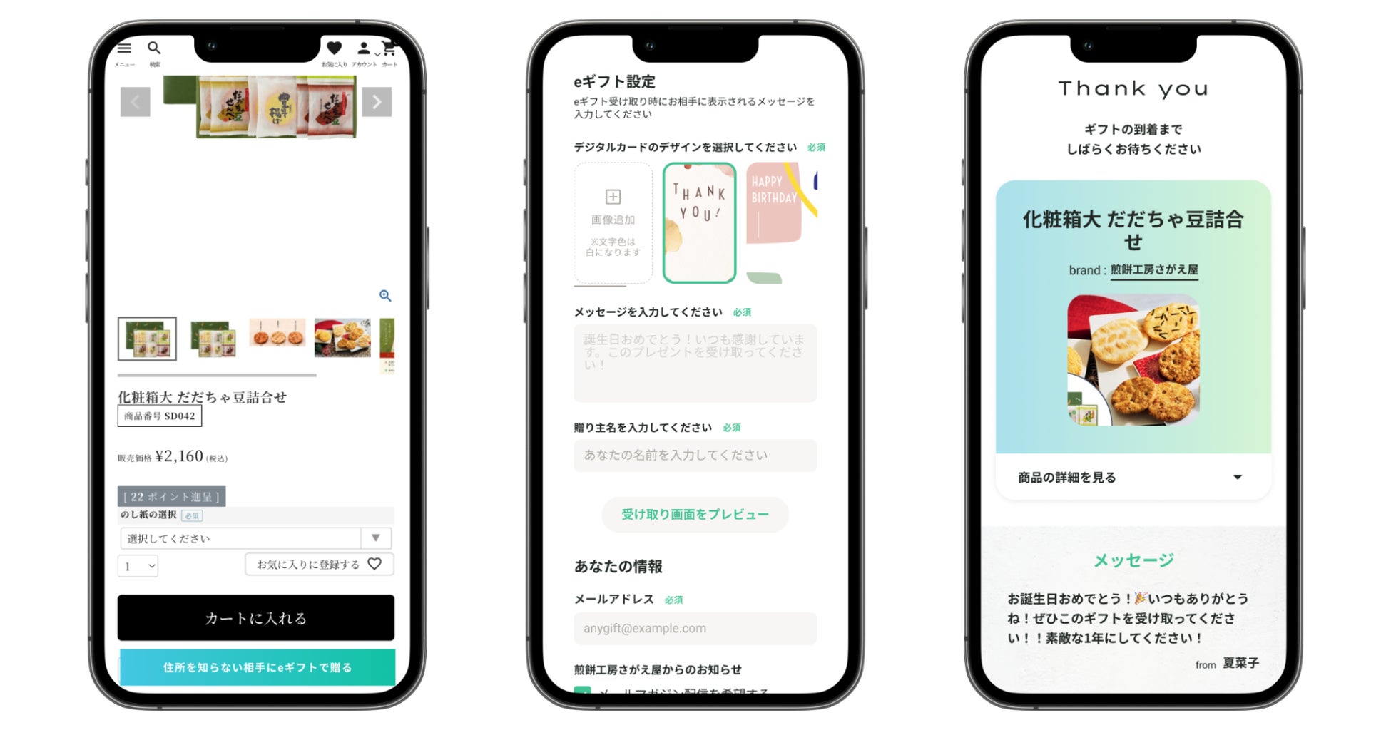 今回のAnyGiftの提供により、「煎餅工房さがえ屋」にて全ての商品がeギフトとして贈れるようになります。