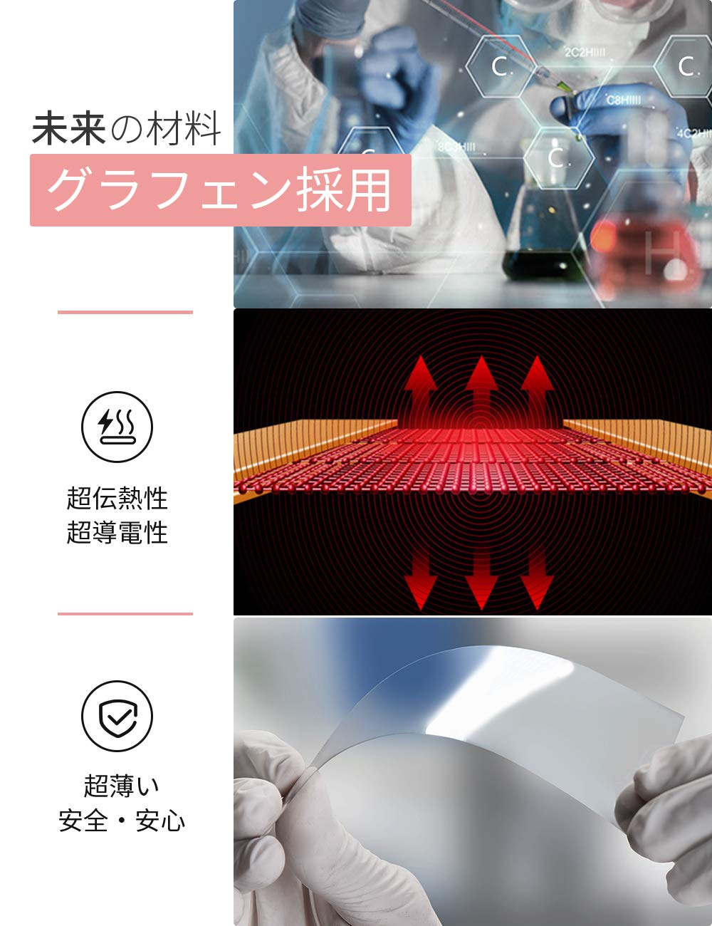 ラフェン材料は安っぽい銅発熱配線と違い、電気の伝導率は銀より高く、熱の伝導率は銅の10倍ほどなので、それを利用して作った本製品は電源に繋ぐと、急速に加熱し、10秒以内にすぐに温まります。