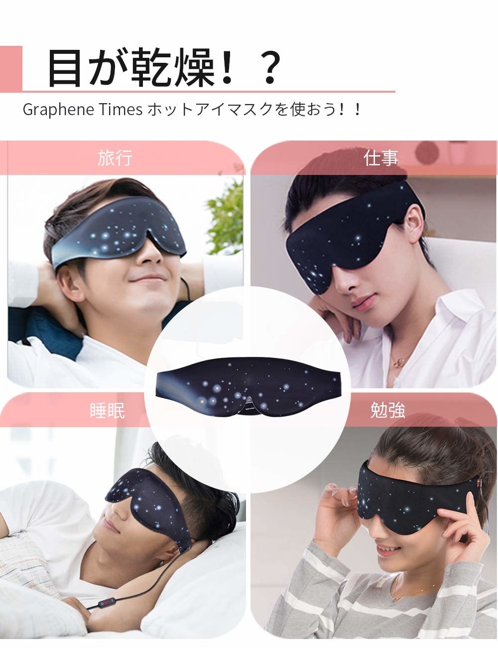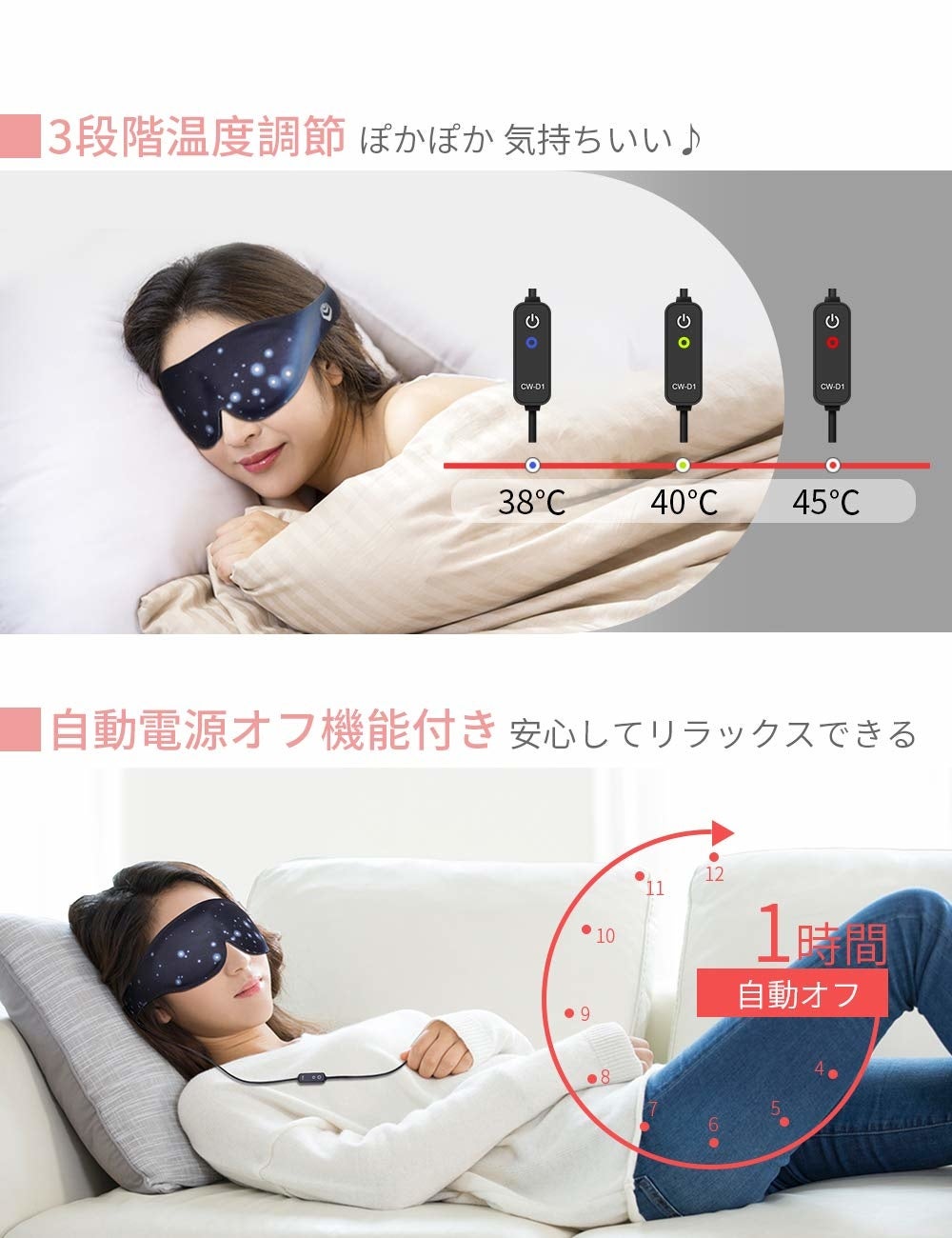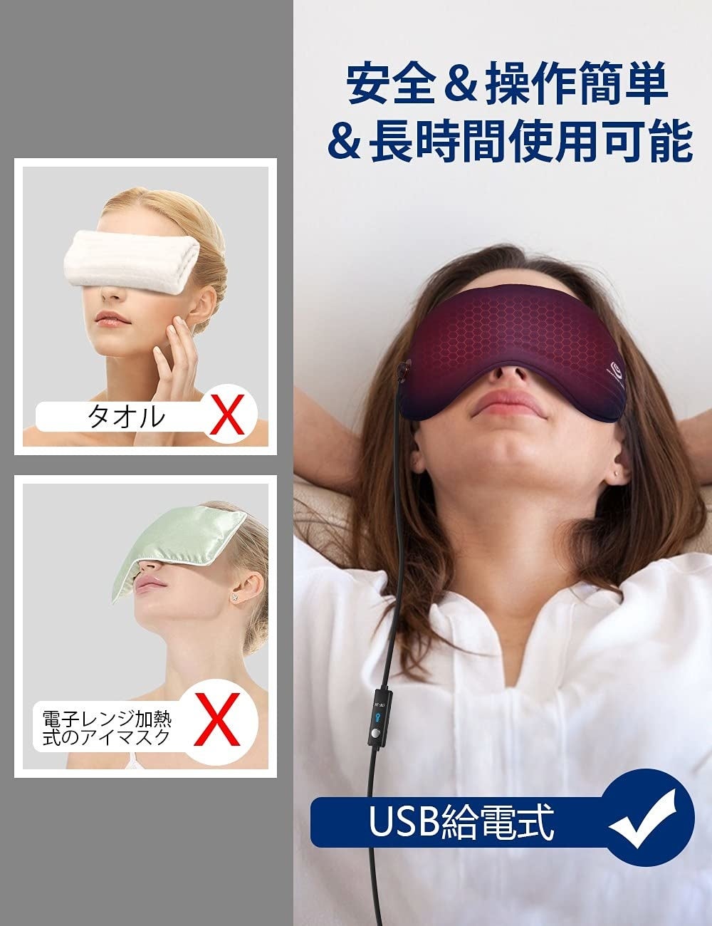 USB給電式なので、電子レンジ加熱式のホットアイマスクより継続的に発熱できるので、より快適です。また、使い捨て式と比べて、繰り返し使用できるので、コスパが高くて経済的です。