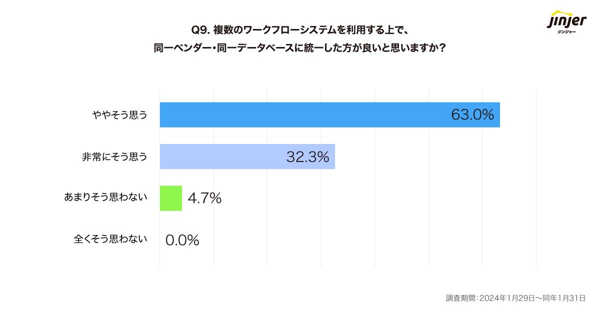 複数のワークフローシステムを利用する上で、「同一ベンダー・同一データベースに統一した方が良いと思うか」という質問をしたところ「非常にそう思う(32.3%)」「ややそう思う(63.0%)」であわせて95.3%の企業が、統一した方が良いと回答しました。