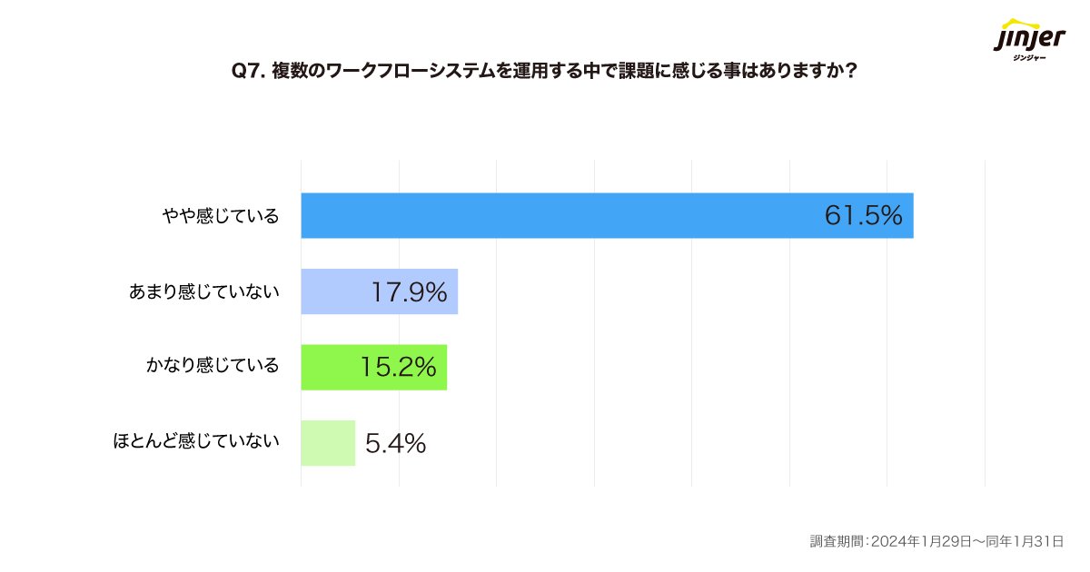 複数のワークフローシステムを利用する企業で「課題をやや感じている(61.5%)」「課題をかなり感じている(15.2%)」と、あわせて76.7%が何かしらの課題感を持っていると回答しています。