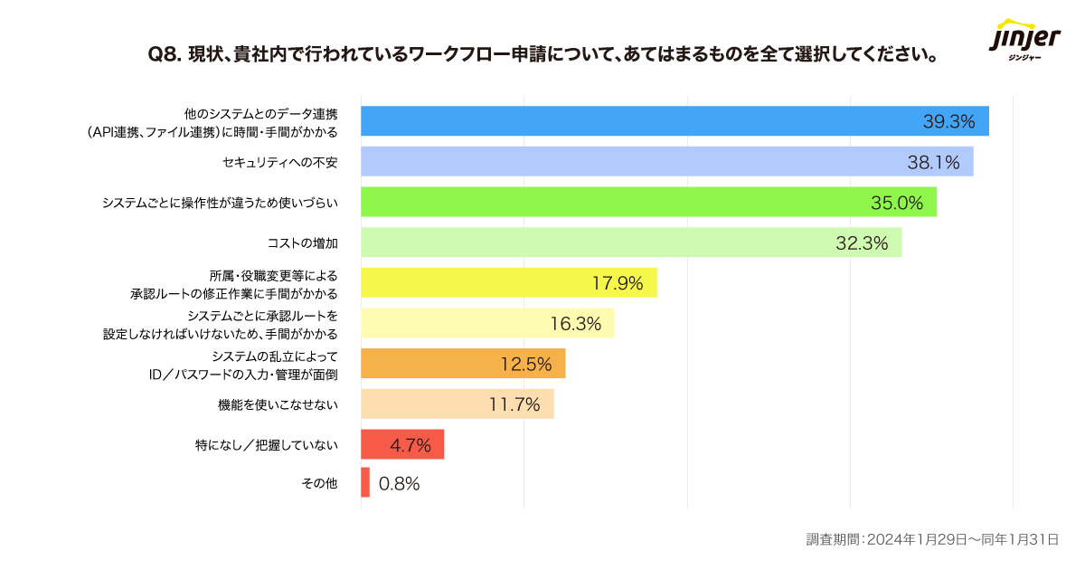 また、利用する中で感じた課題として最も多い回答は「他のシステムとのデータ連携(API連携・ファイル連携)に時間・手間がかかる(39.3%)」。次いで「セキュリティへの不安(38.1%)」「システムごとに操作性が違うため使いづらい(35.0%)」「コストの増加(32.3%)」という結果でした。