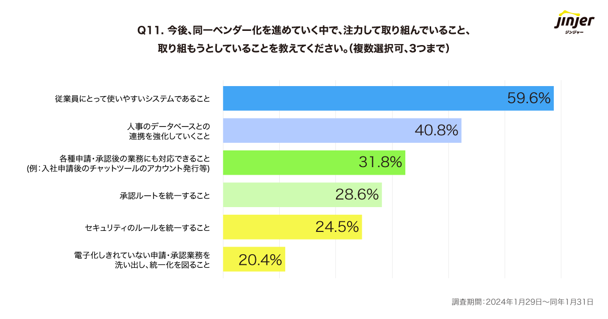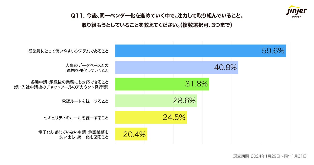 また、同一ベンダー・同一データベースに統一した方が良いと感じている現状を受けて、注力して取り組んでいること、今後取り組もうとしていることについて質問したところ、「従業員にとって使いやすいシステムを選定すること(59.6%)」が最多回答でした。次いで「人事のデータベースとの連携を強化していくこと(40.8%)」、「各種申請・承認後の業務にも対応できること(31.8%)」、「承認ルートを統一すること(28.6%)」という結果となりました。