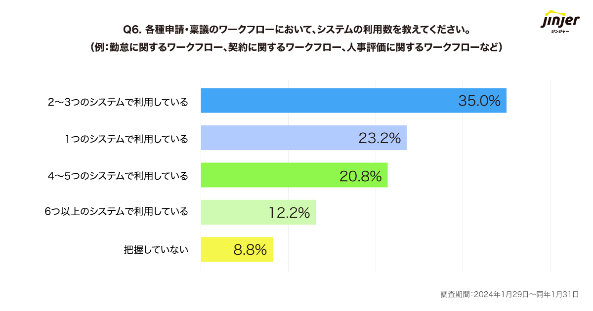 その中で、各種申請・稟議のワークフローにおけるシステムの利用数を質問したところ、「2~3つの利用(35.0%)」「4~5つの利用(20.8%)」「6つ以上の利用(12.2%)」と、複数のシステムを利用している企業があわせて70%弱という回答になりました。