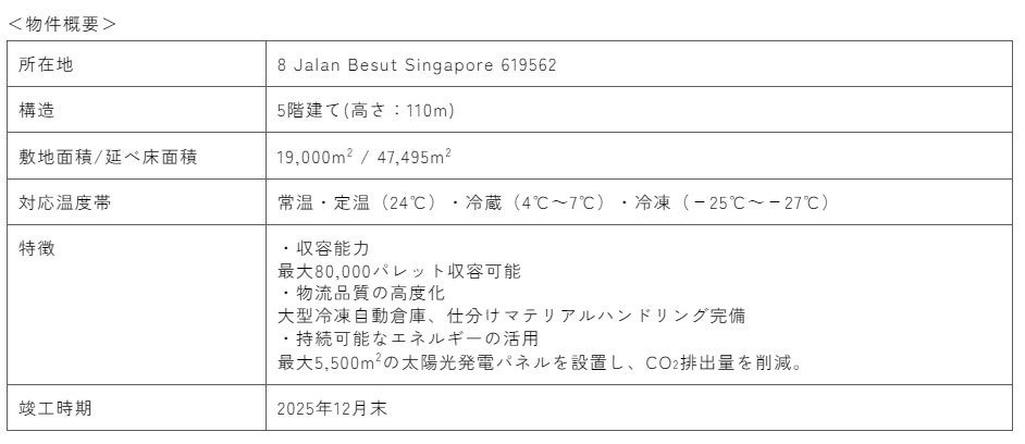 本事業は、港湾施設や主要高速道路ICから至近距離で食品集配送に適した立地にあるシンガポール政府関連公社認定のFood Zone(註)内に位置します。保管する貨物に応じた温度設定が可能で、一部に完全自動倉庫エリアを導入するなどの高機能大型冷凍冷蔵倉庫です。さらには、省エネ型冷却機器の採用と、屋上階に太陽光パネルを設置するなど、環境にも配慮した設計となっています。