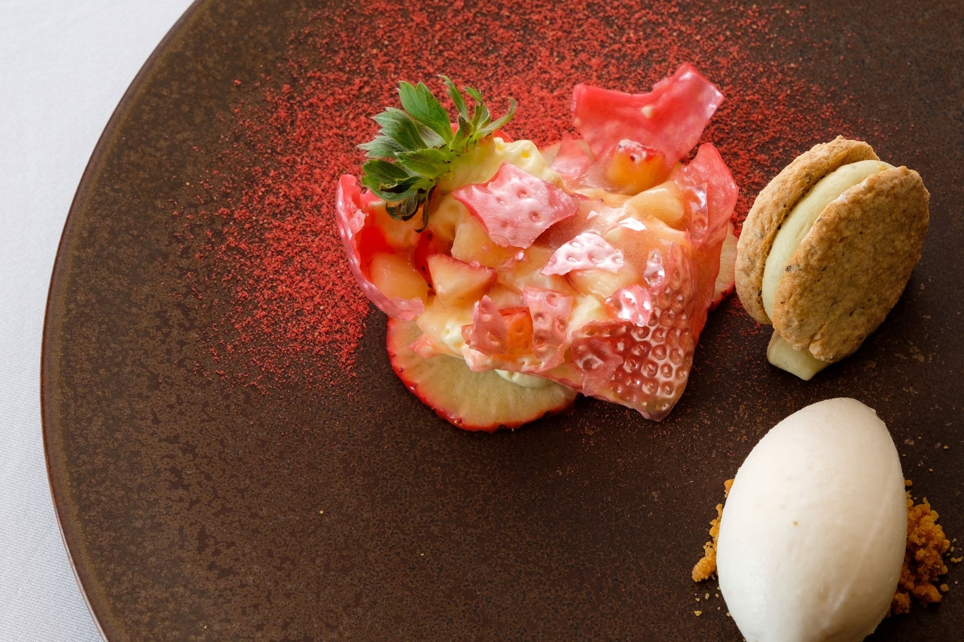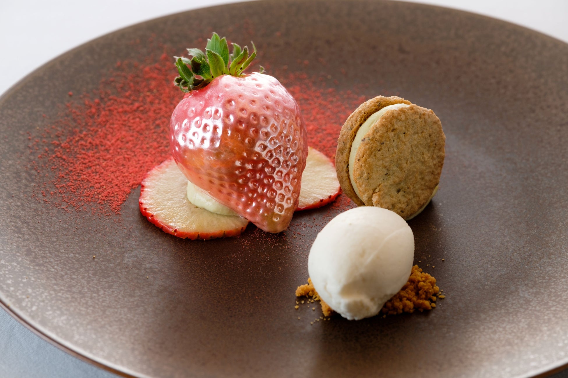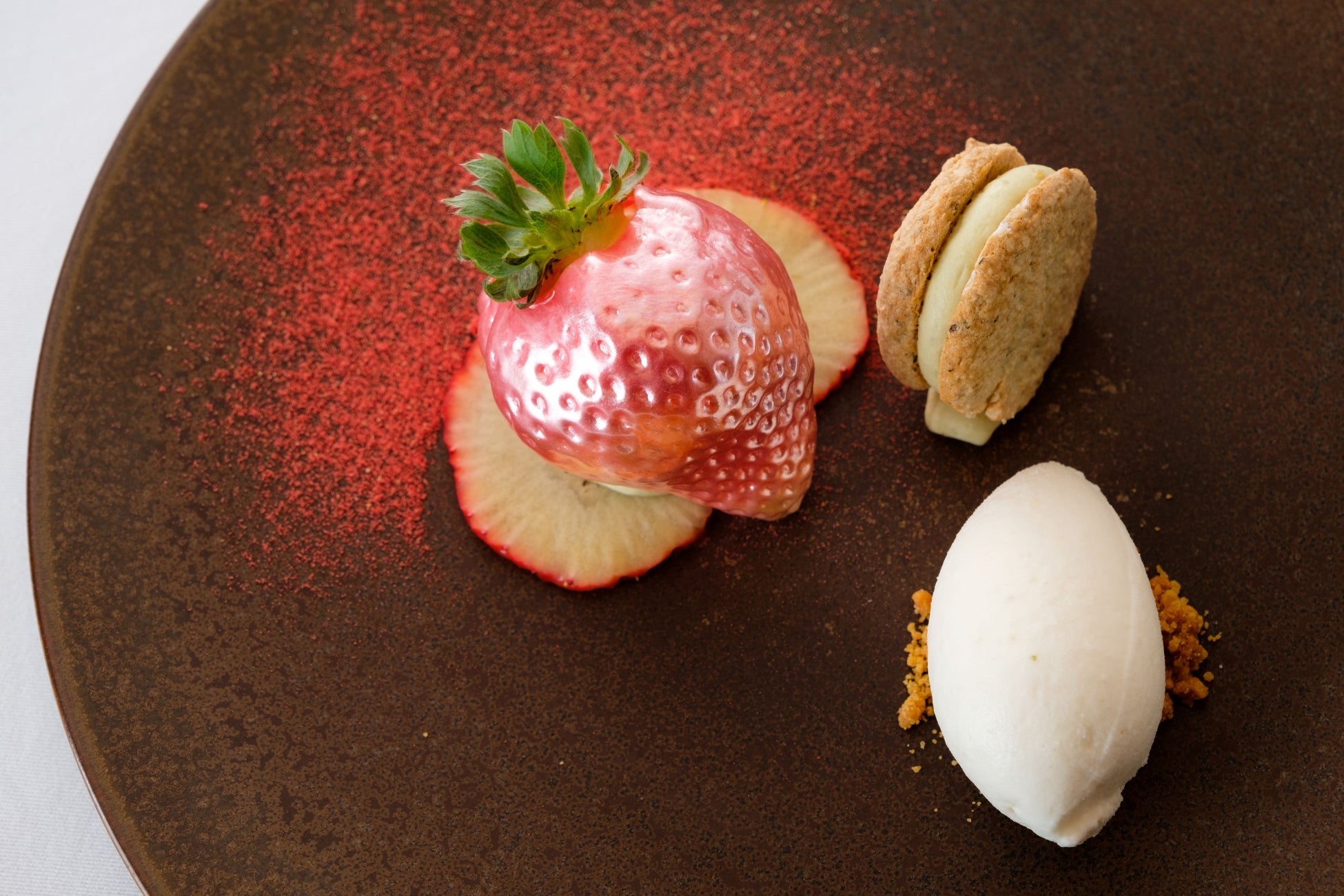 中央の"まるごとの苺"は、実は苺を模った飴細工。中に福岡県筑後市『あつひろ農園』のオリジナルブランド苺「みつのか」とマスカルポーネを忍ばせた、楽しく、おいしい一品です。