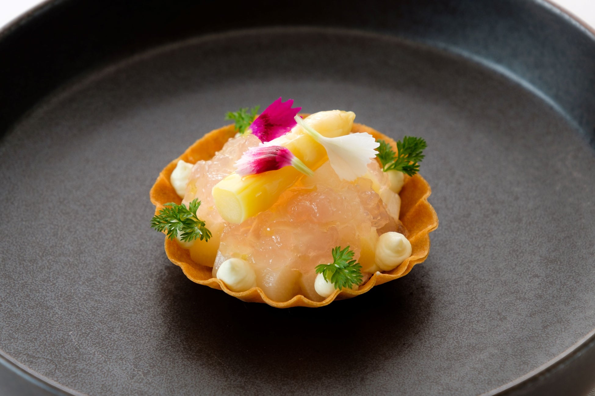 佐賀県の農家・今村さんより届くホワイトアスパラガスに、昆布出汁と桜の葉の塩漬けのジュレを合わせた前菜。ジュレの下に隠れた生ハムとクリームチーズが絶妙な塩味と旨味を添える味わい深い一品です。ホワイトアスパラガス、ジュレ、タルトの食感の組み合わせもお楽しみください。