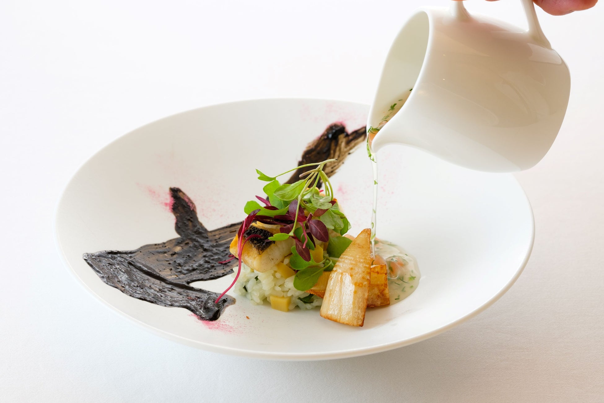 産直鮮魚のソテーに、鹿児島県産のタケノコとアサリの出汁で炊いたリゾットを合わせました。ソースは、桜の香りを付けて細かく刻んだトマトとハーブを使い、春の風味豊かな味わいに。水墨画のように描かれたイカスミとトマトのソースで、味の変化もお楽しみください。
