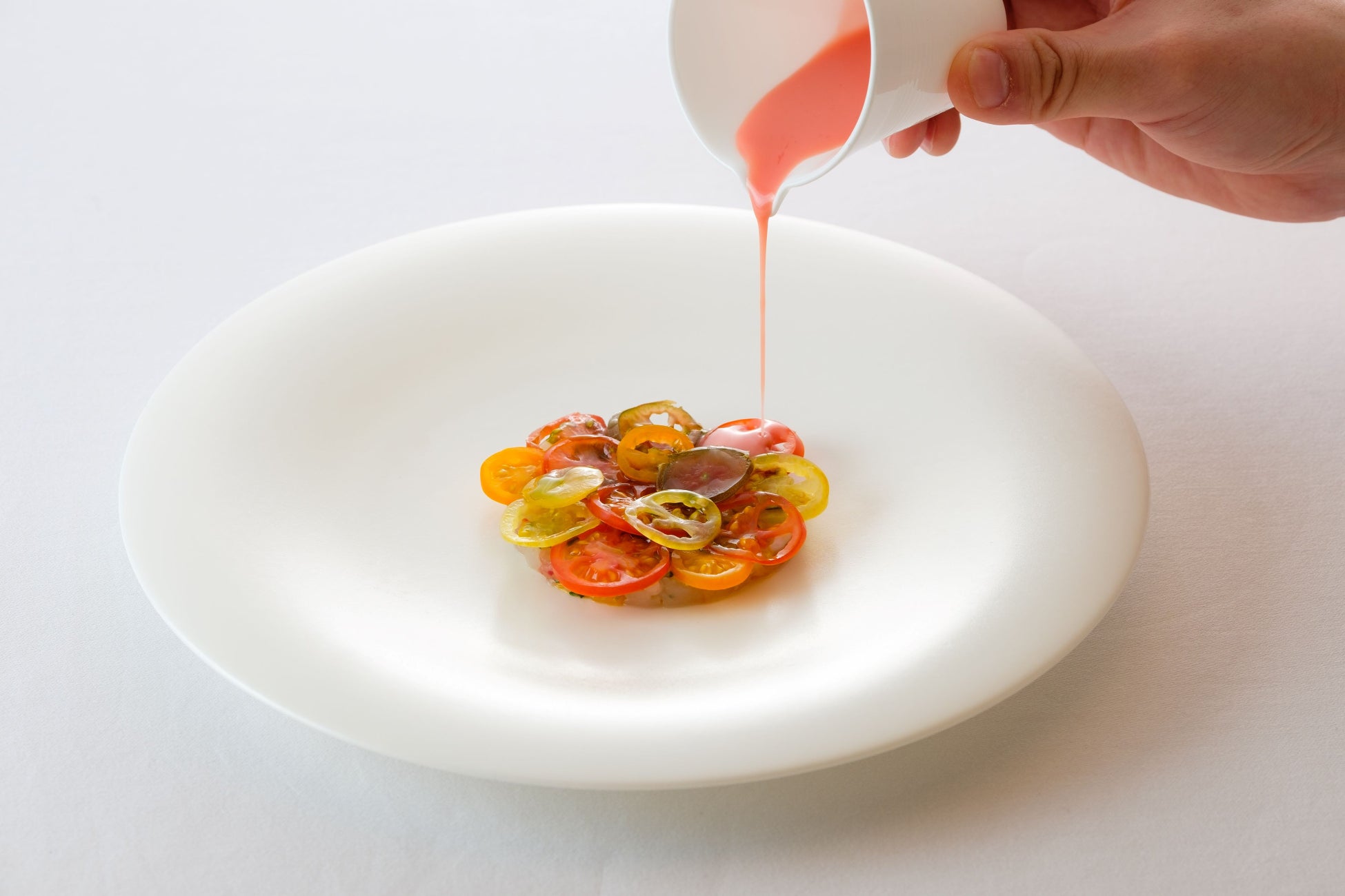 福岡県・糸島産のカラフルなトマトの下に、薩摩甘海老を忍ばせた彩り豊かな一皿。能古島『久保田農園』のブラッドオレンジをグリルし凝縮させた特製ソースを掛けて仕上げます。トマト、甘海老、ブラッドオレンジソースの甘味に、ワサビオイルの刺激がアクセントとなり、春の爽やかな味わいを演出します。