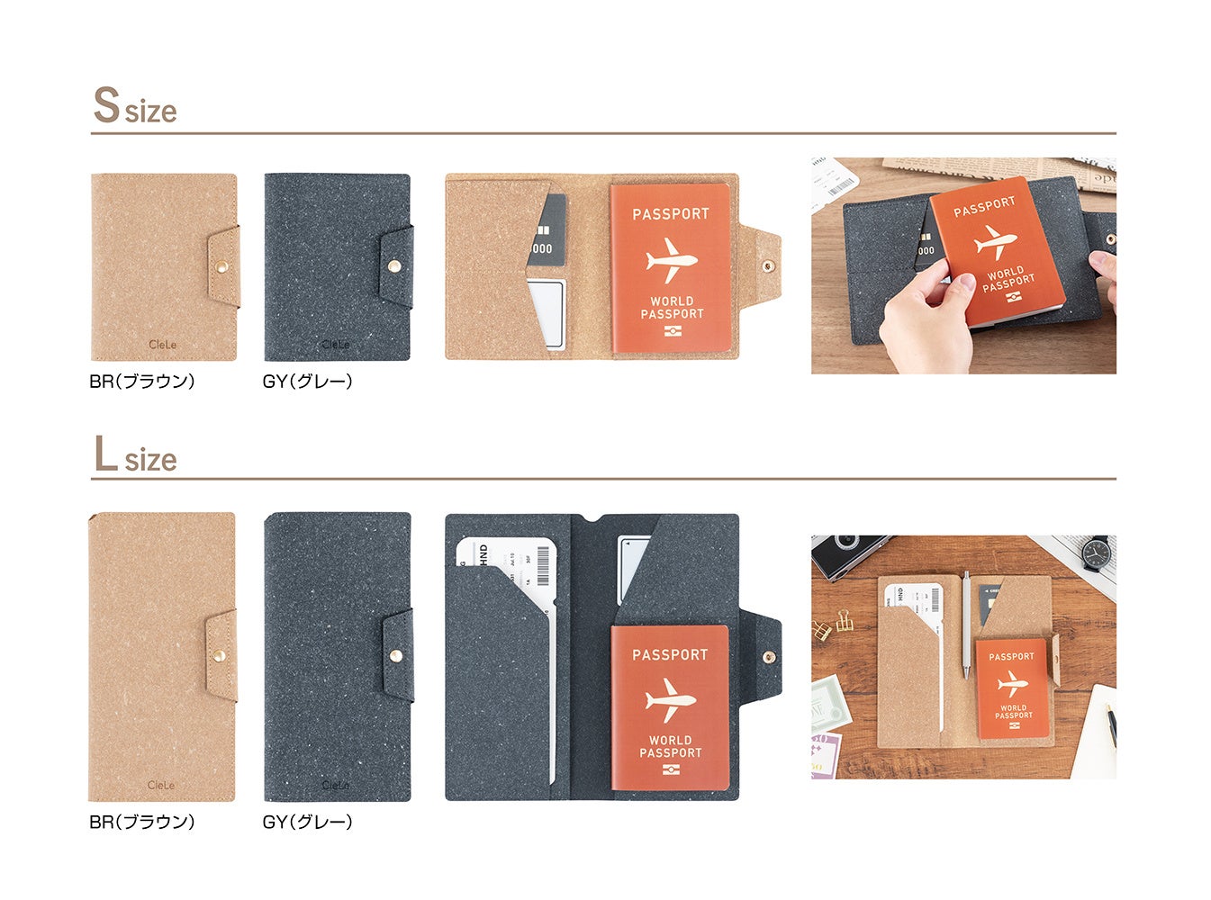 パスポートがぴったり収まるSサイズと、パスポートと旅券、紙幣やカードなどたっぷり収納ができるLサイズの2サイズをラインアップ