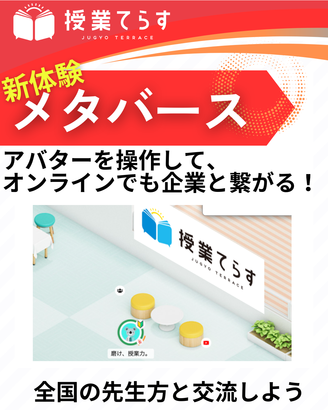 【授業てらすメタバース】(8/4~11※参加無料)先生向けの企業展示会開催!メタバース上で、先生や企業の方々と交流を深めることができます。