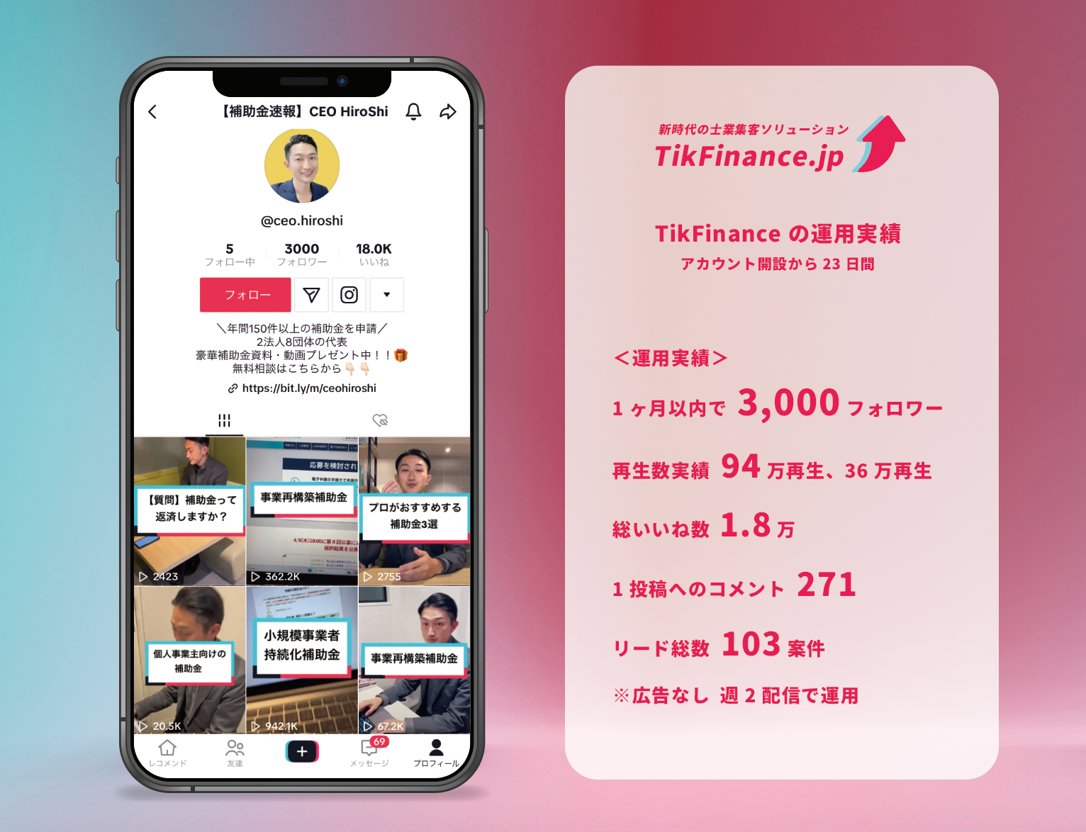 【金融・財務系チャンネル専門のTikTok運用】新時代の士業集客ソリューション「TikFinance」が補助金TikTokアカウントの運用実績を公開 23日で3000フォロワー、103リード獲得