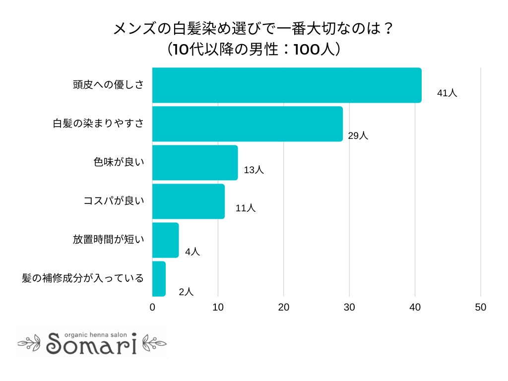 株式会社AWA(https://a-w-a.co.jp/)が運営する地域密着型白髪染め専門美容室ソマリ(https://a-w-a.co.jp/hennasalonsomari/)は、日本全国の10代以上の男性を対象に「メンズの白髪染め選びで一番大切なのは?」とアンケート調査を実施しました。