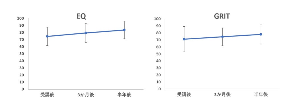 2021年8月の事前調査の結果、研修への継続的な参加が「目標達成力」「EQ」「GRIT」を向上させる可能性が示唆されておりましたが、2021年10月から2022年6月までの追跡調査の結果、アチーブメントテクノロジーコース受講後半年経過すると、「目標達成力」「GRIT」「Well- being」「EQ」が向上することがわかりました。