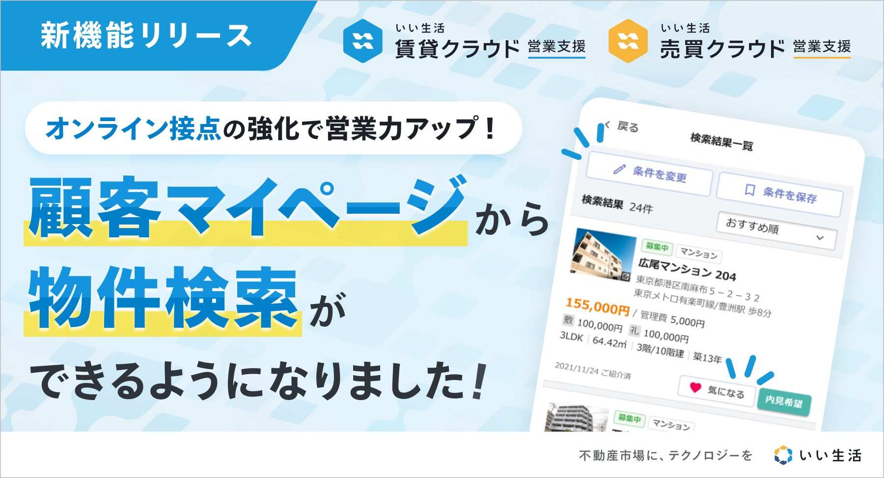 不動産業務を網羅するバーティカルSaaSと業務効率を推進するBPaaS(※1)で不動産市場のDXを推進する株式会社いい生活(東京都港区、代表取締役社長 CEO:前野 善一、東証スタンダード:3796、以下:いい生活)は、「いい生活賃貸クラウド 営業支援」「いい生活売買クラウド 営業支援」において、顧客マイページに「物件検索機能」を追加したことをお知らせいたします。