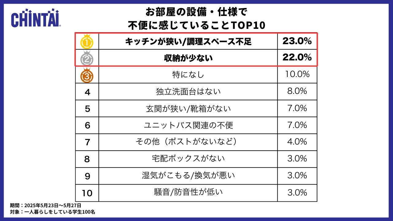 近年、物価高の影響などから限られた空間で生活する若年層が増えています。その結果、「狭さ」や「収納不足」といった賃貸物件ならではの課題がより顕在化しています。CHINTAIが2025年5月に学生100名を対象に実施した調査でも、「キッチンが狭い」(23.0%)、「収納が足りない」(22.0%)といった不満が上位に挙がり、半数以上が不便を解消できていないことがわかりました。