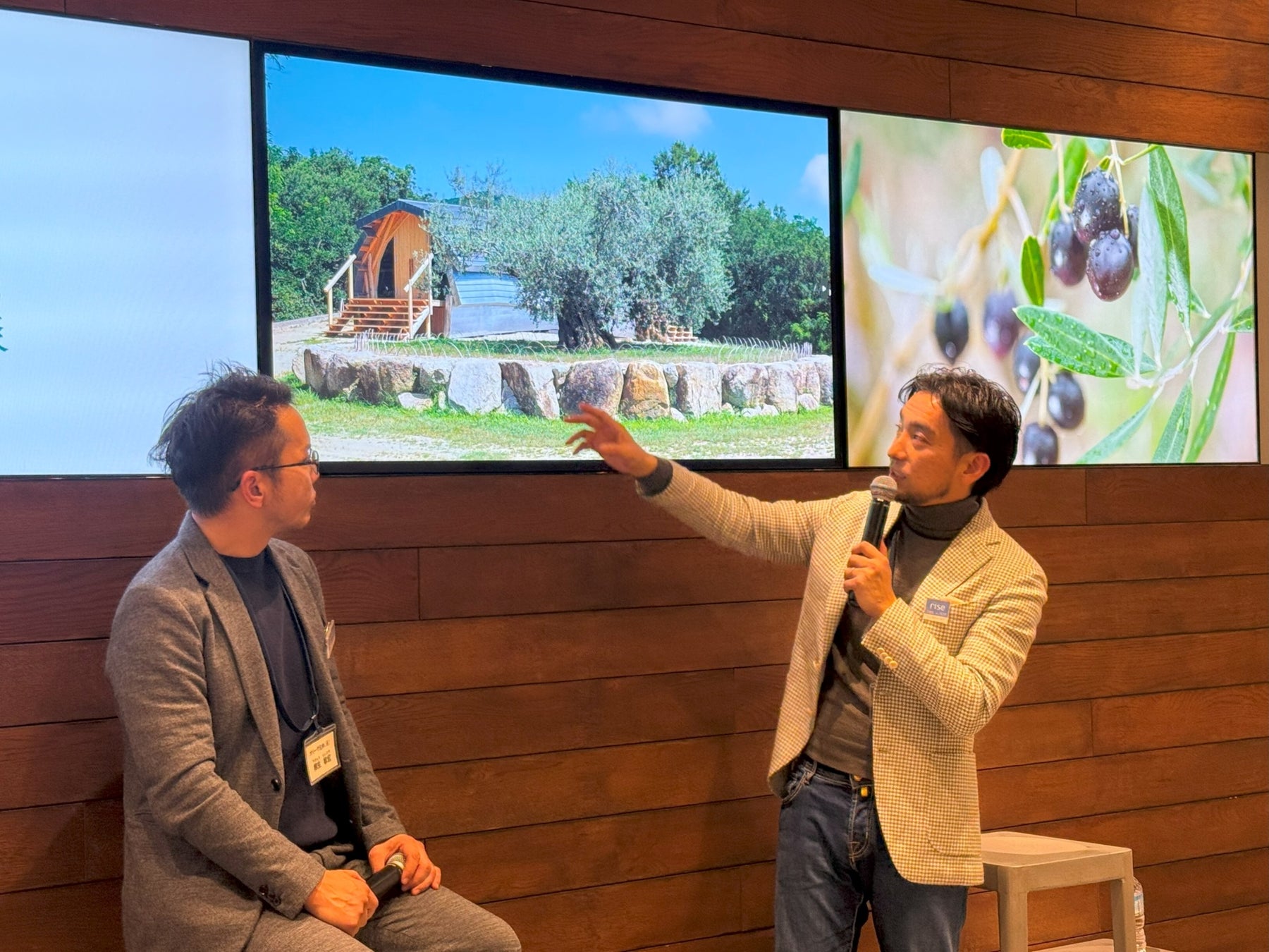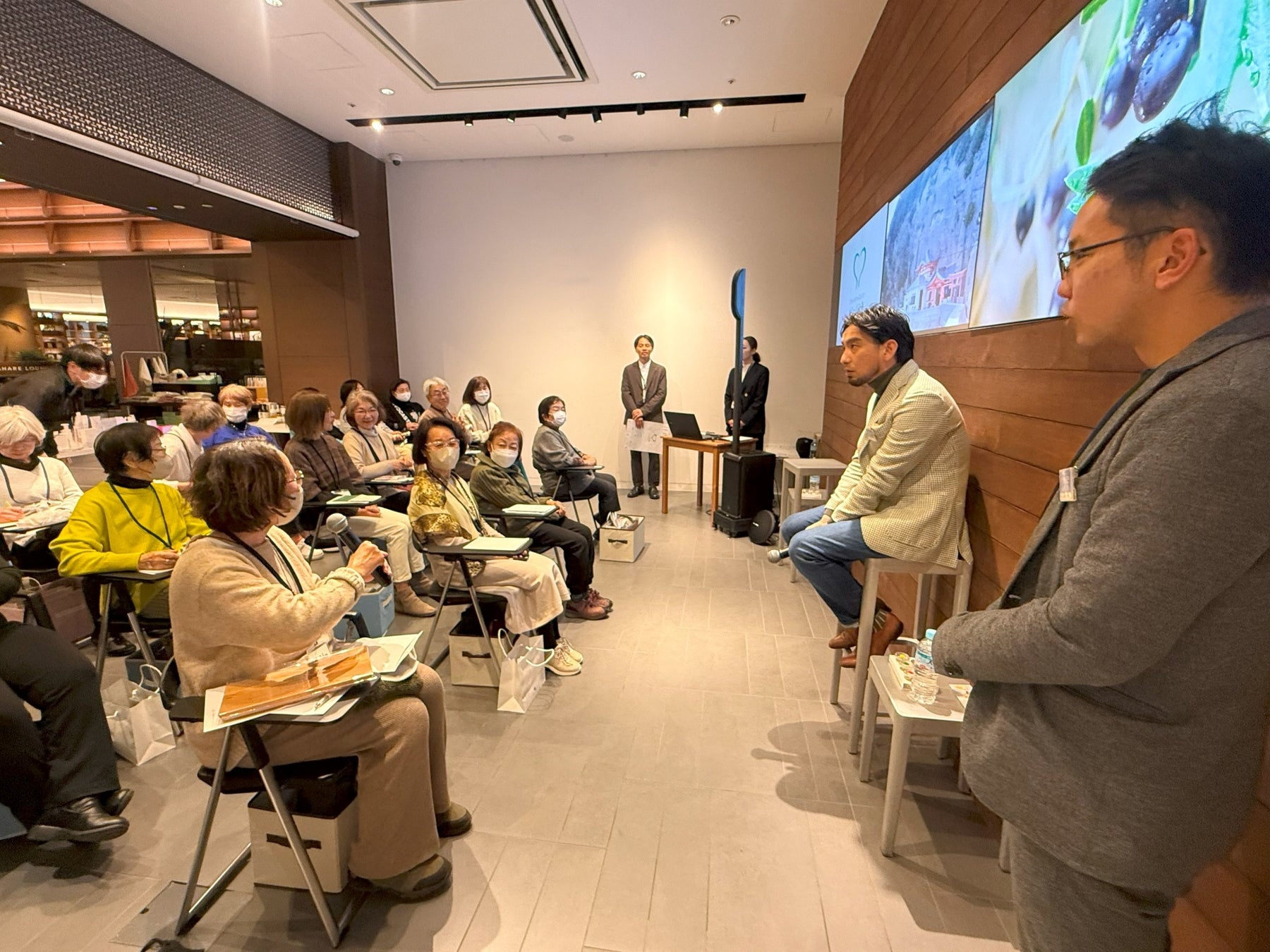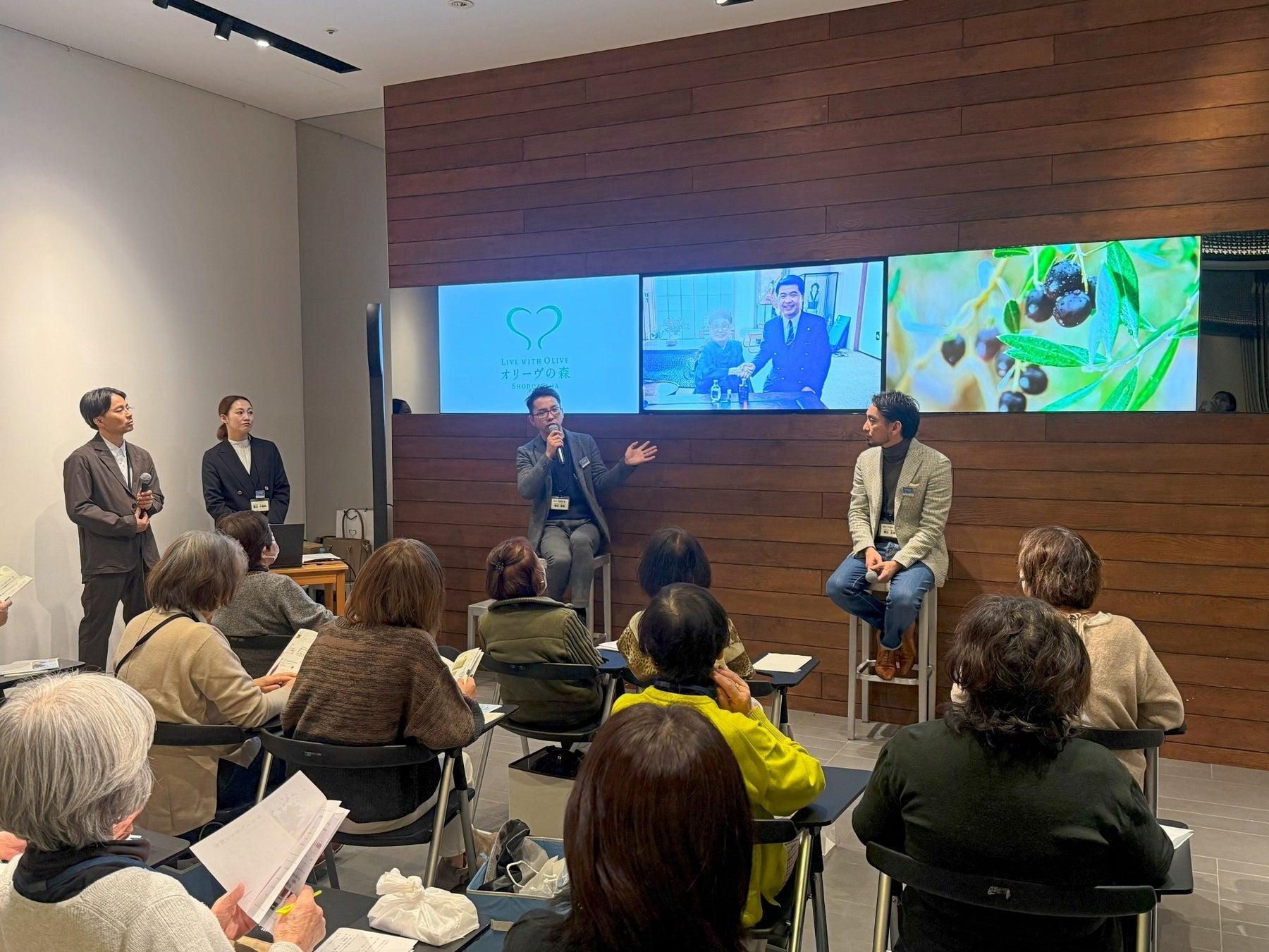 香川県の小豆島でオリーブの栽培・研究開発・製造・販売を手掛ける小豆島ヘルシーランド株式会社(本社:香川県小豆郡、代表取締役社長:柳生敏宏)は、大切な顧客様(通信販売商品のご愛用者)との絆をより深めるため、2025年1月16日に二子玉川 蔦屋家電E-room1にて親睦会を開催。前半では、創業時の様子や当社の主力商品で2024年に発売30周年を迎えた「ジ・オリーヴオイル」の誕生秘話、小豆島やオリーブの魅力を改めてお伝えし、後半ではオリーブオイルテイスティング体験やプレゼント抽選会などを行い顧客様との交流を深めました。