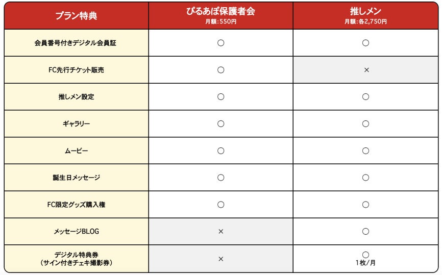 オフィシャルファンクラブ「ぴるあぽ保護者会」では、ライブイベントのチケット先行販売や、限定公開の個別メッセージ、推しメン設定、ギャラリー、ムービーなど盛りだくさんの内容でコンテンツを展開予定です。