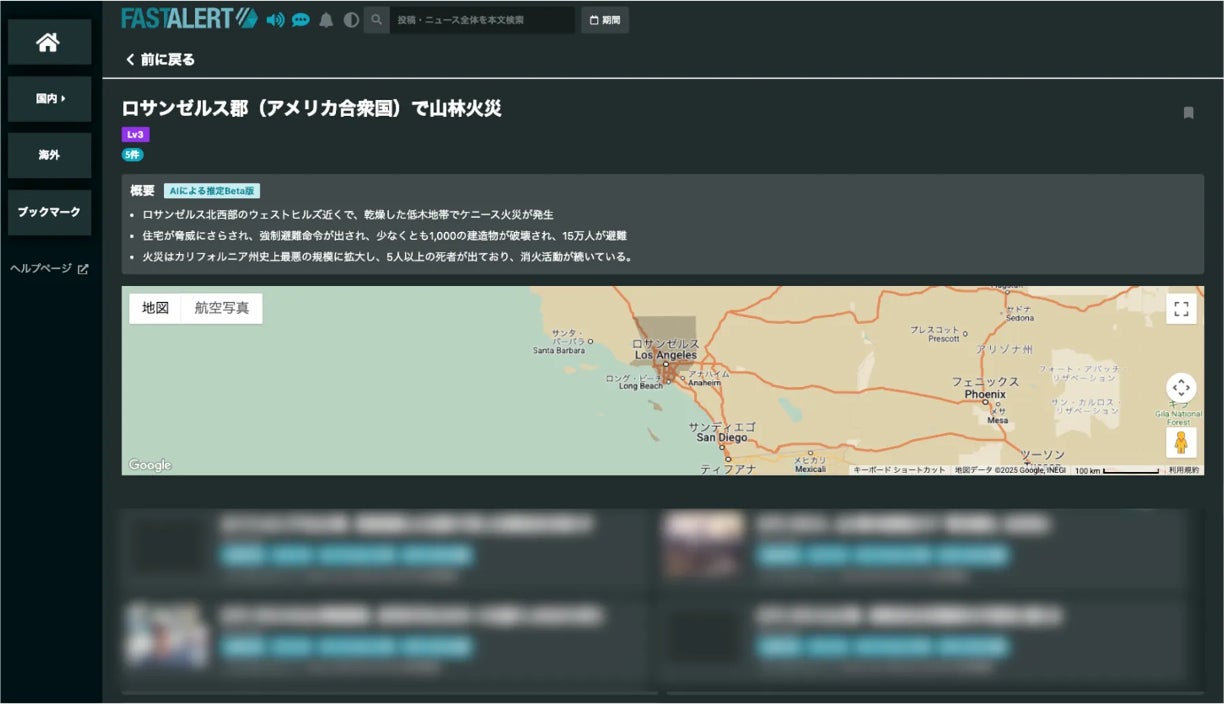 「FASTALERT」は、国内外の災害、事故、事件などのリスク情報をインターネット上の多様な情報源からAIが収集・分析し、デマやフェイクニュースを排除した、信頼できる情報のみをリアルタイムで配信するWebサービスです。同サービスは、リリース後7ヶ月でNHKと全ての民放キー局、全ての一般紙に採用されるなど多くの報道機関をはじめ、民間企業や官公庁・自治体に幅広く採用されております。今般、AI技術の加速度的な進化を反映し、「FASTALERT」の海外リスク情報の収集機能を大幅刷新し、世界各地の事件・事故・災害、デモやストライキなどのあらゆるリスク事象を、より迅速かつ正確に「日本語で」検知できるようになりました。
