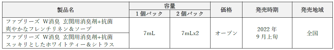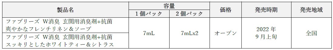 「ファブリーズ W消臭 玄関用消臭剤+抗菌*1」は「爽やかなフレンチリネン&ソープ」と「スッキリとしたホワイトティー&シトラス」の2種類の香りのラインナップで販売いたします。
