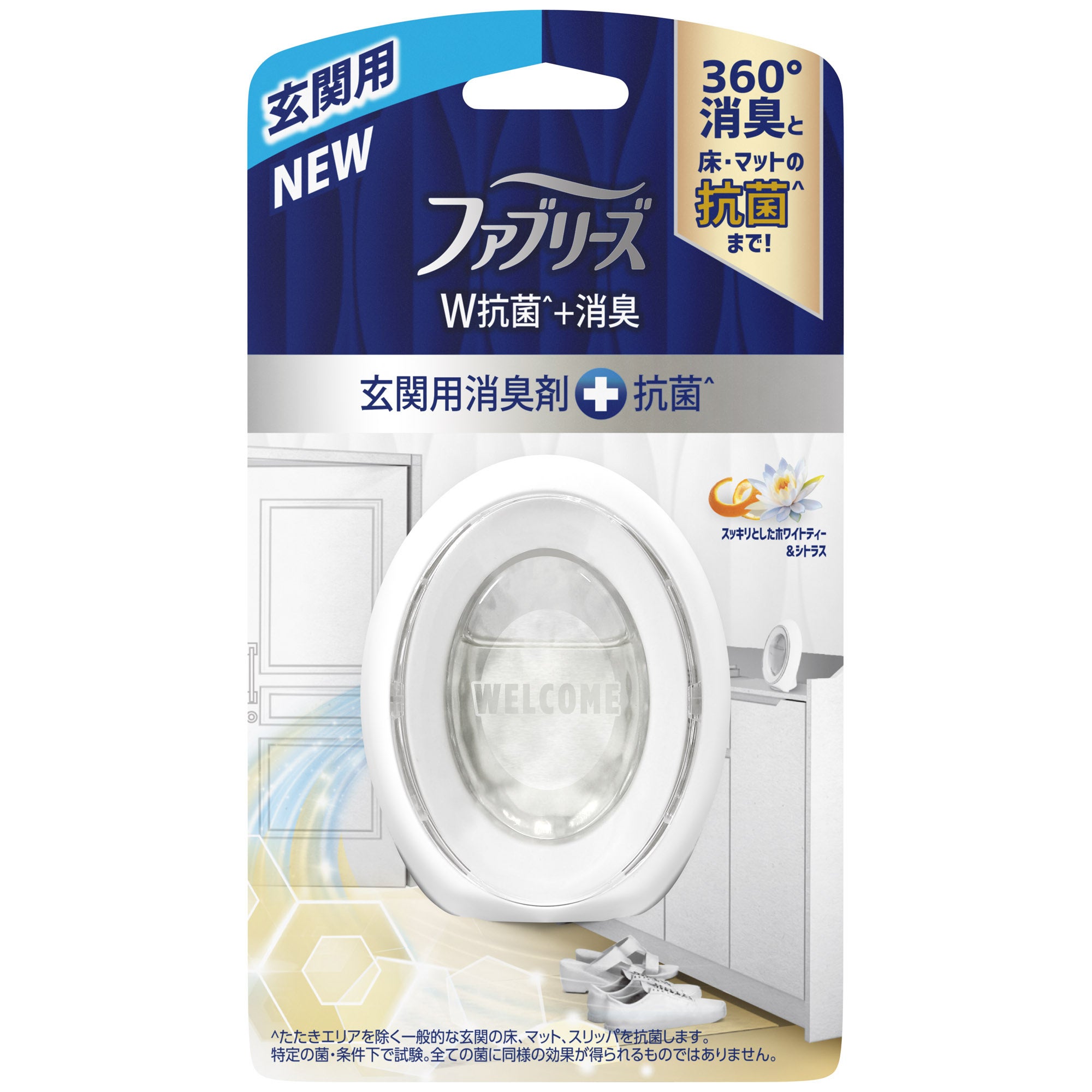 「ファブリーズ W消臭 玄関用消臭剤+抗菌*1」は、独自の「360°消臭+抗菌*1テクノロジー*2」により、玄関に置いておくだけで、自然発想の抗菌*1成分「BIOコートテクノロジー」を空間中に拡散*2させ、床や、マット、スリッパなどの表面を抗菌*1コーティング。これらの表面に付着した菌の繁殖を抑制*1します。さらに、空間全体に漂う“生活臭”もすみずみまで消臭*3し、すっきり爽やかに保ちます。