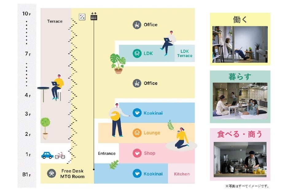 これまで『12』シリーズでは、住まいの機能の一部として多目的に使える「LDK(リビングダイニングキッチン)」をオフィスに取り入れることで、食を通したコミュニケーションから多様な交流が生まれてきました。この企画・運営経験を活かしてシェアオフィスの一部を街に開くことで、多様な価値観が行き交う街のたまり場となり、新しい働き方や暮らし方に出会うきっかけとなる施設を目指します。