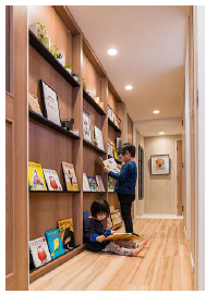 近年、ライフスタイルの変化や様々なメディアの発達・普及により、子どもたちの読書離れが指摘されている。「AKUNDANA」は、そんな子どもたちの読書離れに対応するため、住まいの各部屋をつなぐ廊下を、子どもたちが絵本に親しむ空間に変えることを目的にデザインしました。