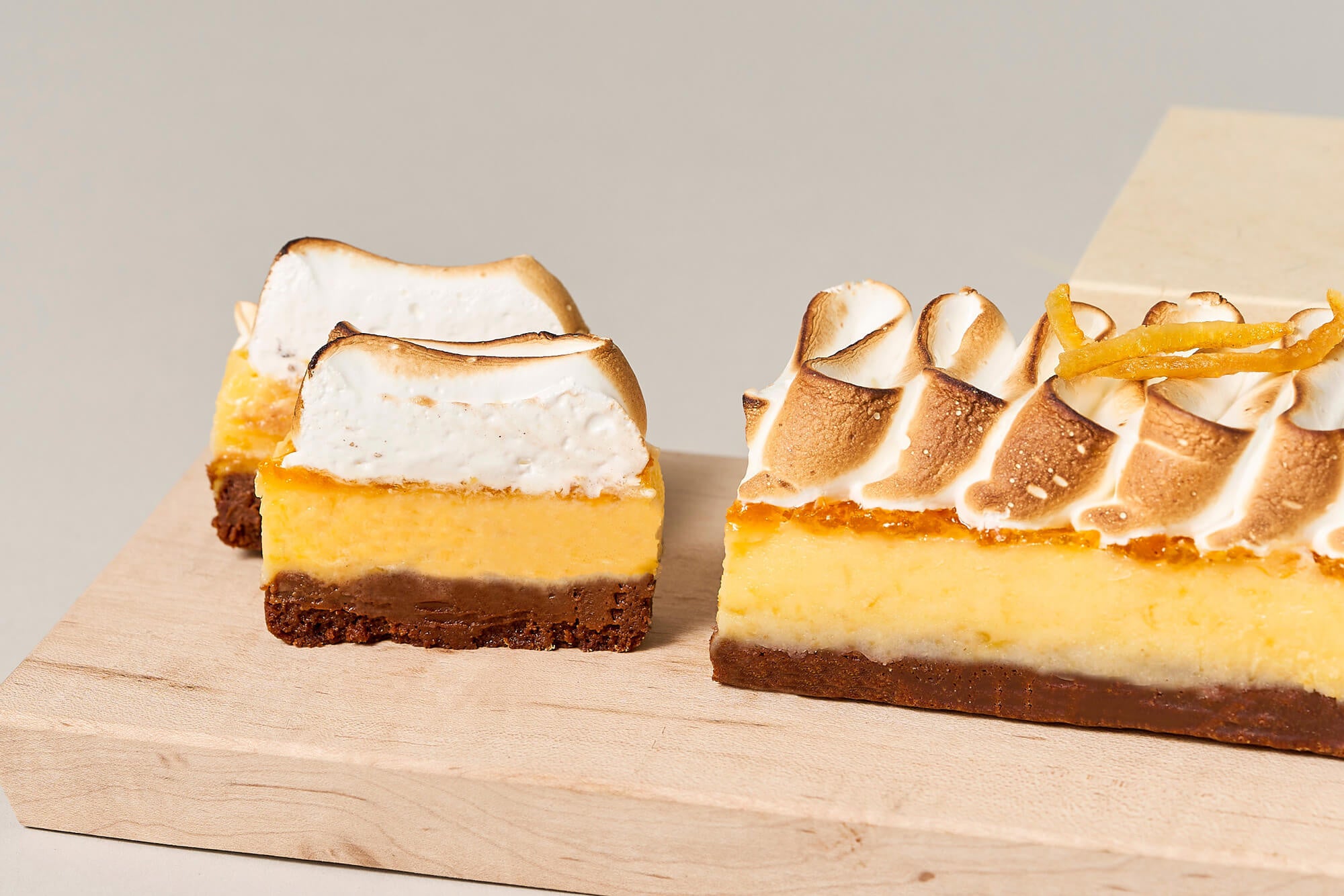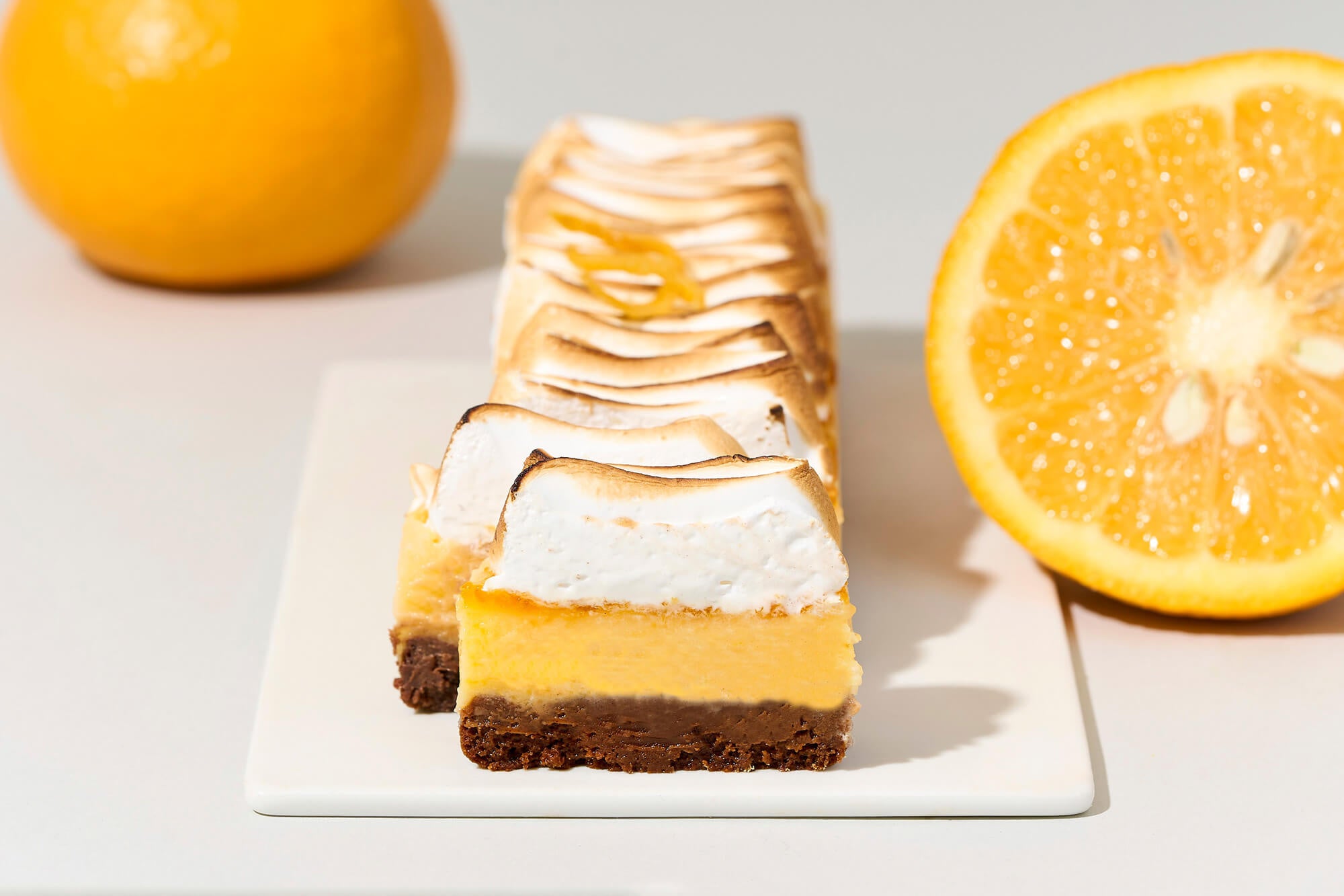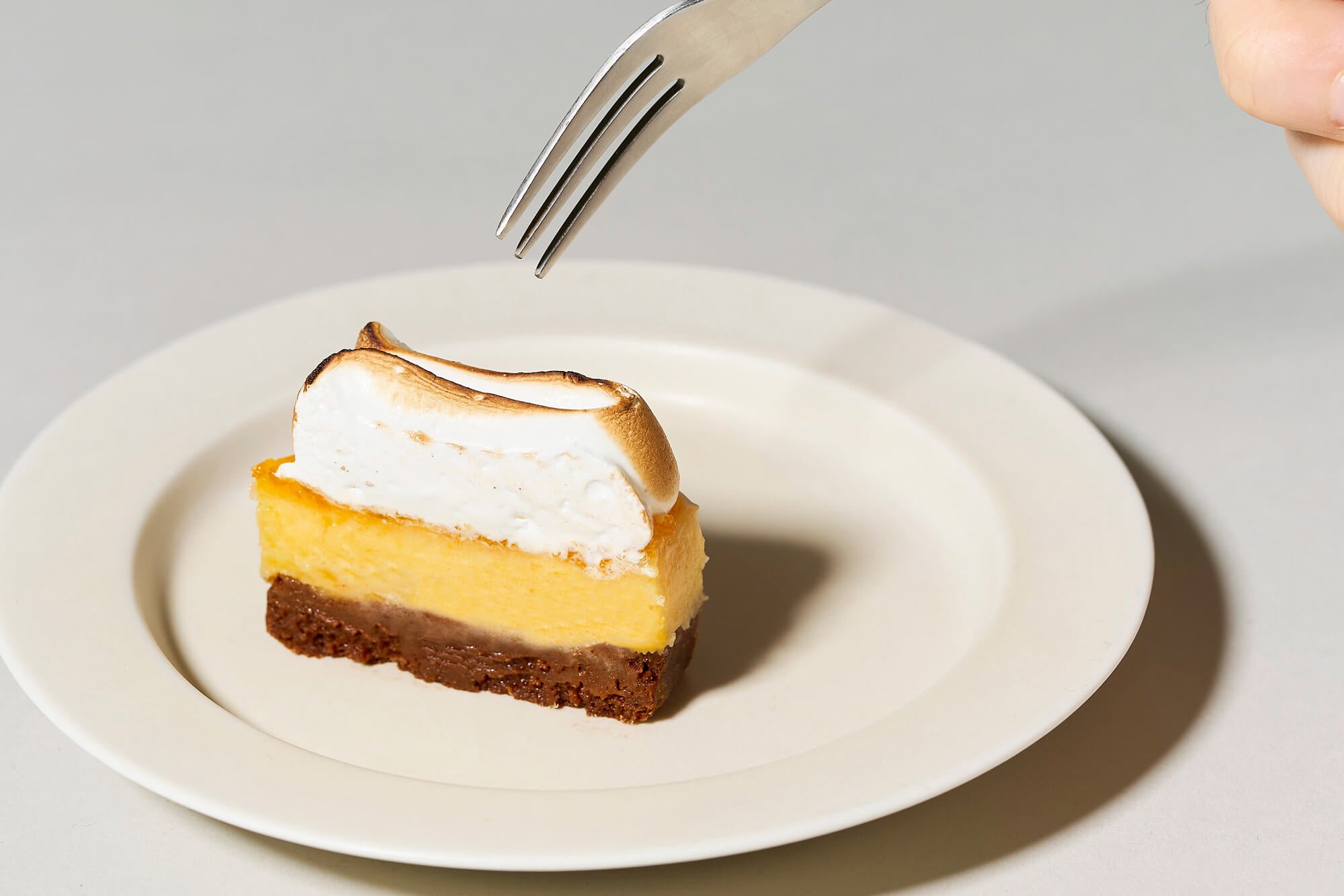 トップには、ふわっと軽く優しい甘さのイタリアンメレンゲをたっぷり載せました。香ばしく焼き色がついたメレンゲは、甘夏の甘酸っぱさとチョコレートの濃厚さに、軽やかにほんのりと甘さを加えます。