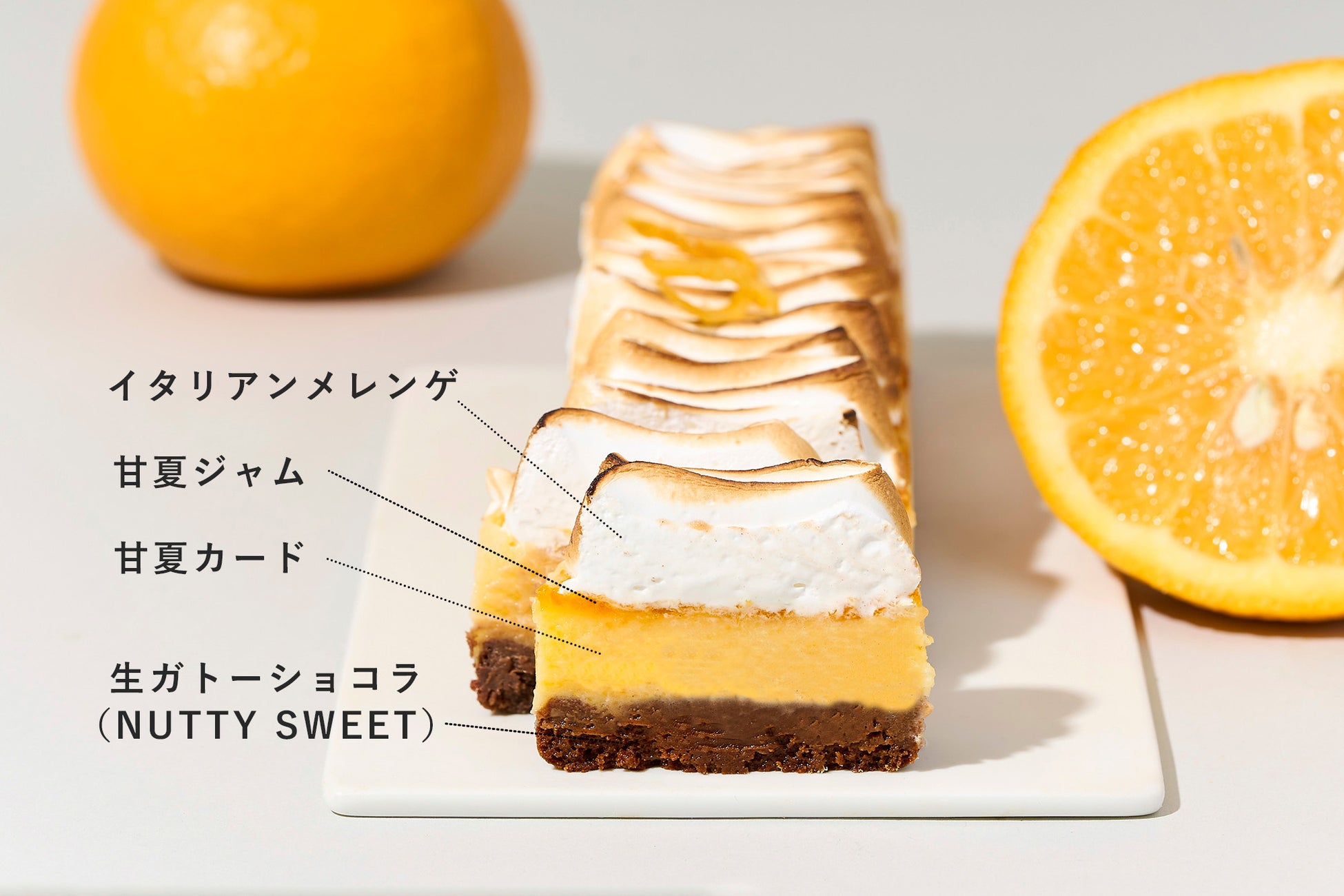 ジューシーで甘酸っぱい旬の甘夏を、なめらかなチョコレート生地と楽しむ生ガトーショコラができました。トップに添えた、優しい甘さですっと溶ける口溶けのイタリアンメレンゲと合わせて、春ならではの軽やかな柑橘スイーツをぜひお楽しみください。